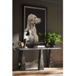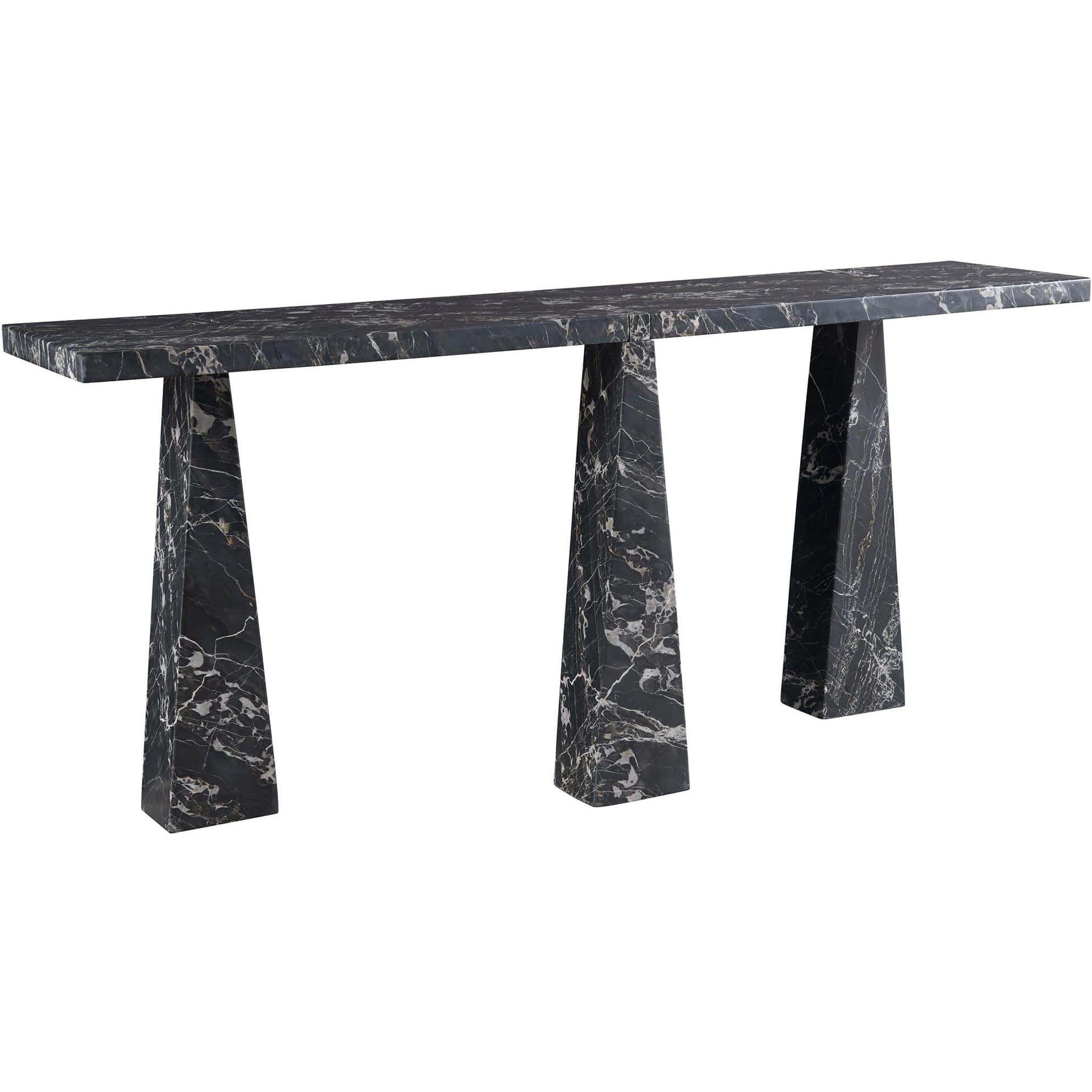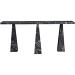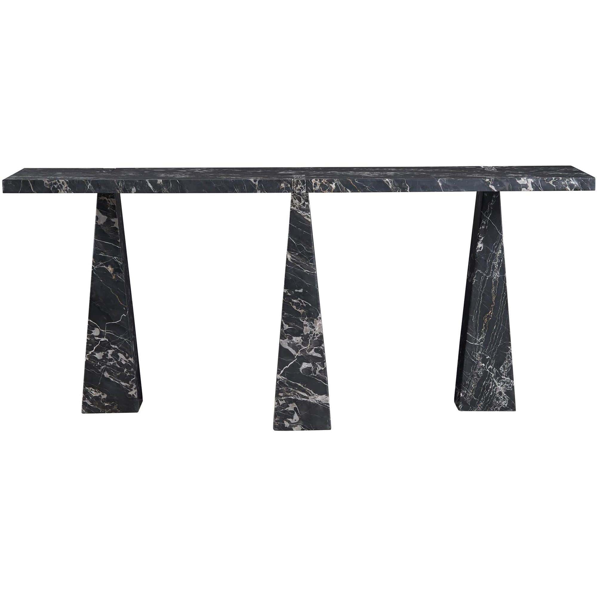The Spectrum Sofa Table is a masterpiece of drama and depth, sculpted entirely from Golden Portoro marble, characterized by its rich, moody tones and striking white veining. Its legs, architectural and sculptural in form, draw inspiration from triangular shapes, adding a layer of intrigue and sophistication to this captivating piece.