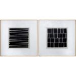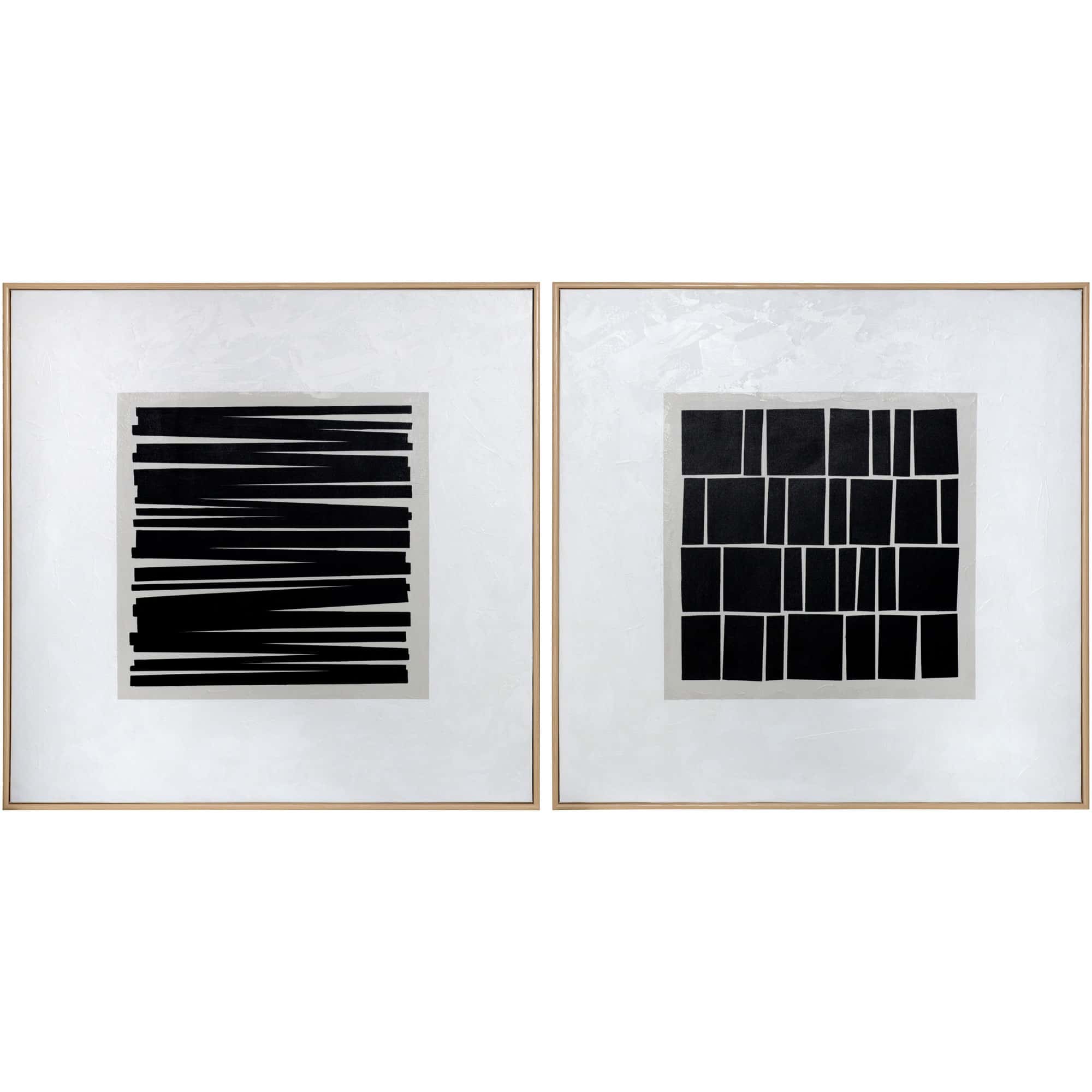 This square diptych features black graphic patterns in the centre of each canvas that are different but coordinate nicely with each other. Can be displayed either side-by-side or stacked for a very dramatic effect. Features a natural wood floater frame. Each artwork is hand-painted and will feature slight variations that make every piece unique.