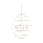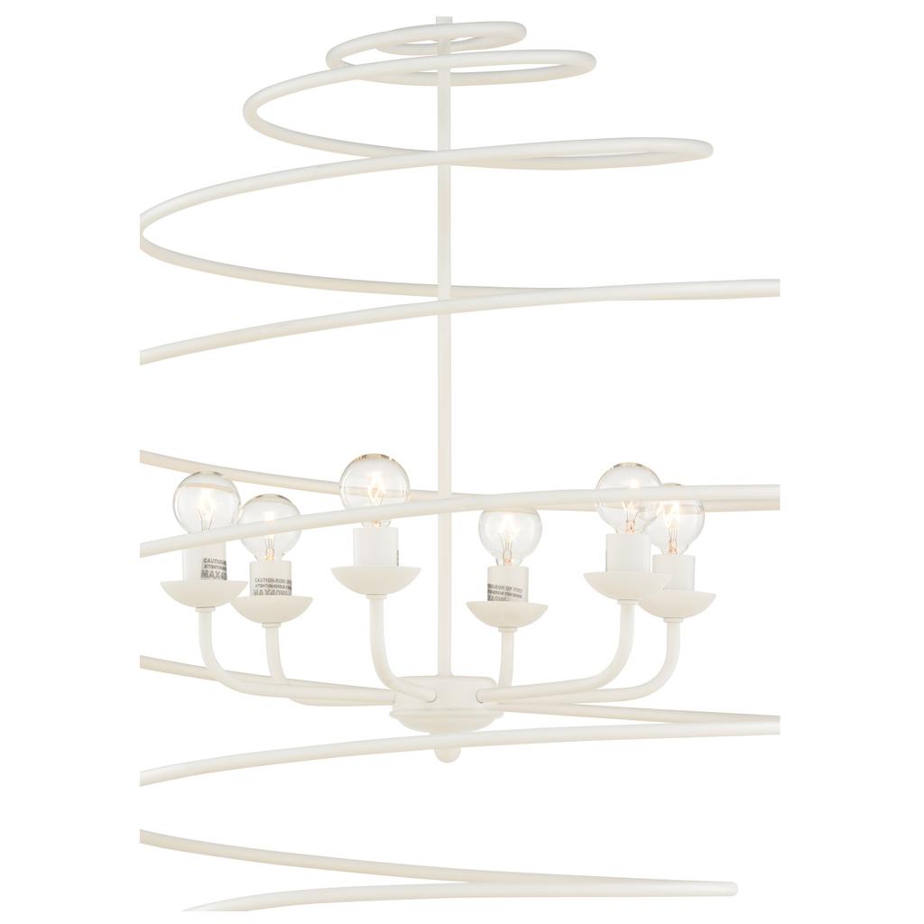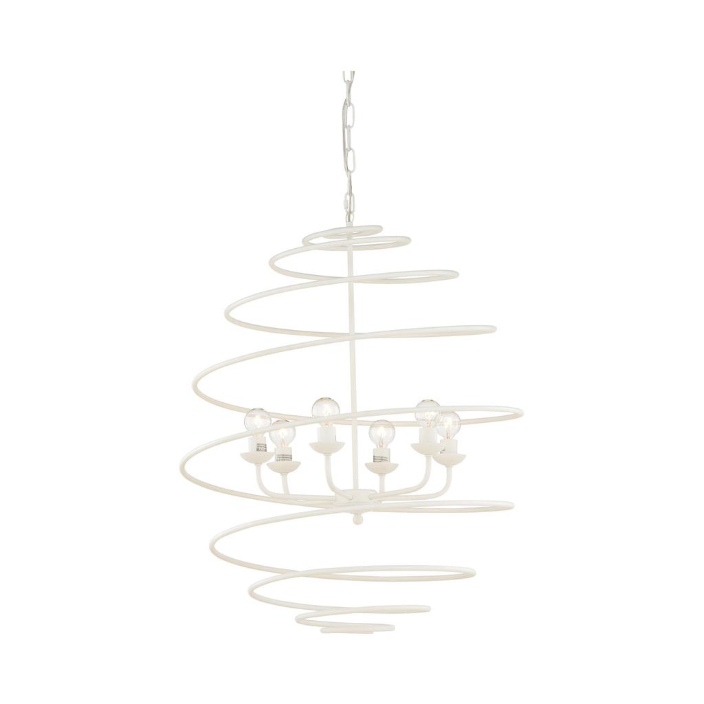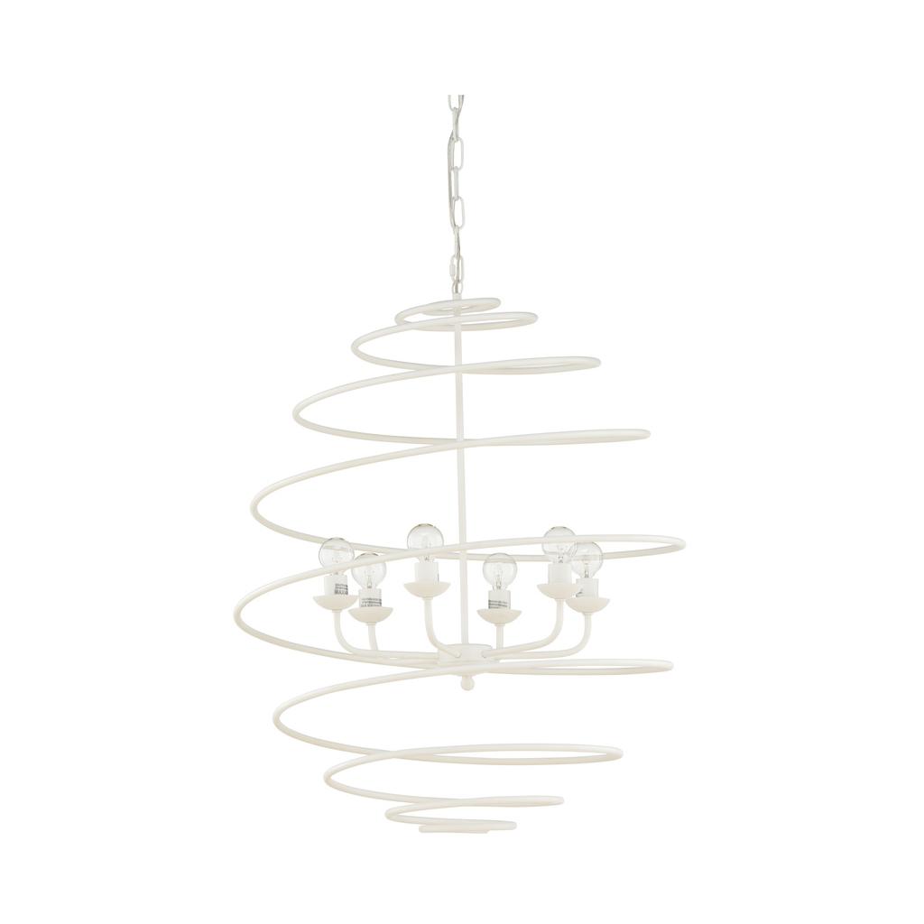 A clever play on a traditional chandelier, the Spyral Chandelier is crafted of 6 bulbs encompassed in a three-dimensional circular metal frame, finished in a matte white. Made in Italy.