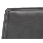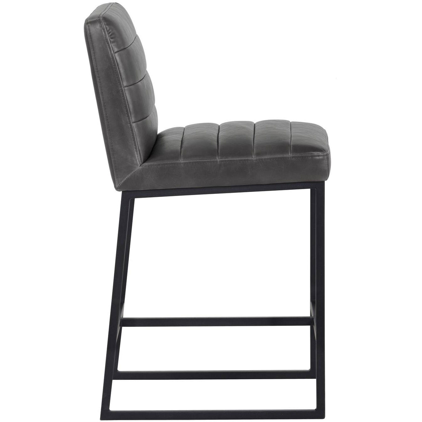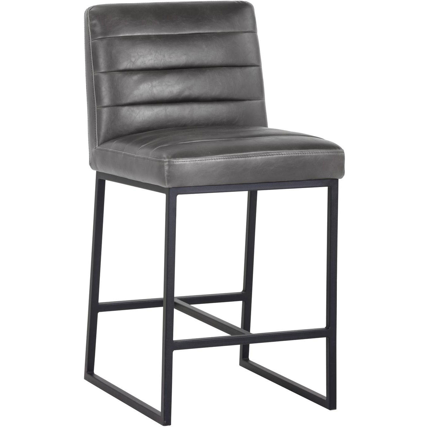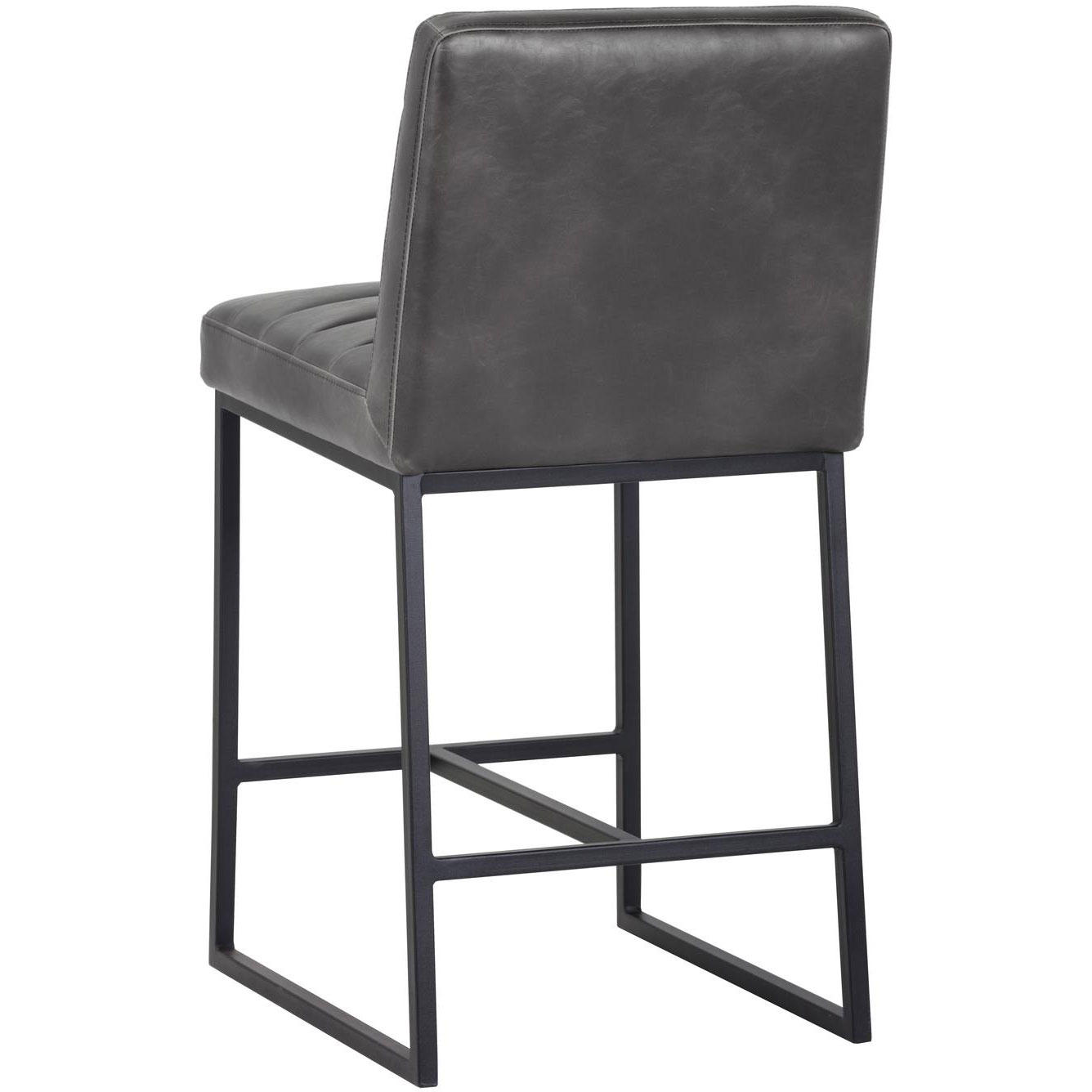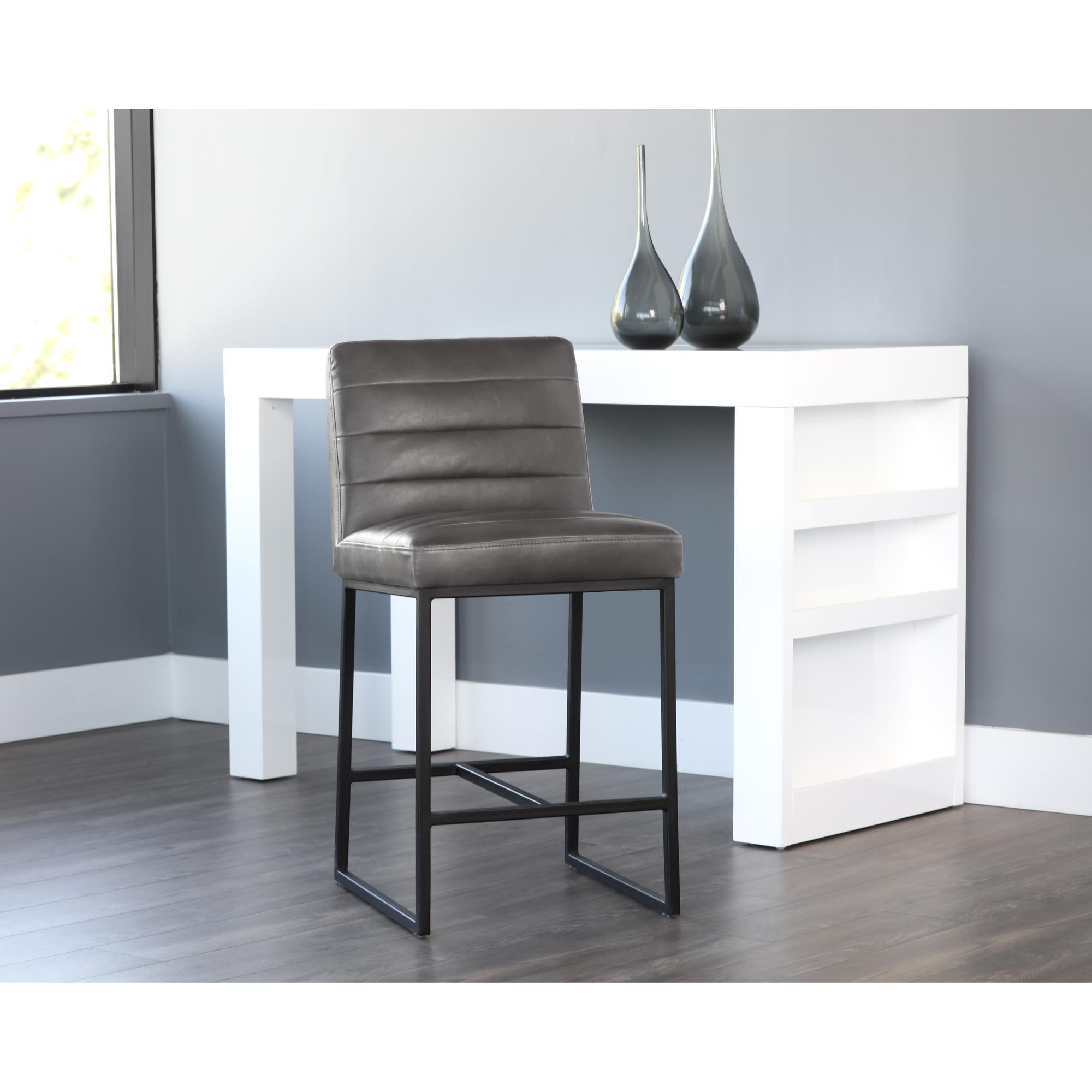 A masculine and modern counter stool. Features horizontal channel tufting on the interior seat and seatback with sleek a black powder-coated steel frame. Stocked in overcast grey faux leather. Suitable for various dining, kitchen and bar spaces of all sizes. Handle With Care: This design has been crafted with faux leather. Faux leather is manufactured to reflect the natural characteristics of leather; as such, colour variations, markings, wrinkles, grooves, and light scratches are appreciated characteristics. No two pieces will be alike. Visit our Product Care page for more information on how to ensure the lasting beauty of this piece.