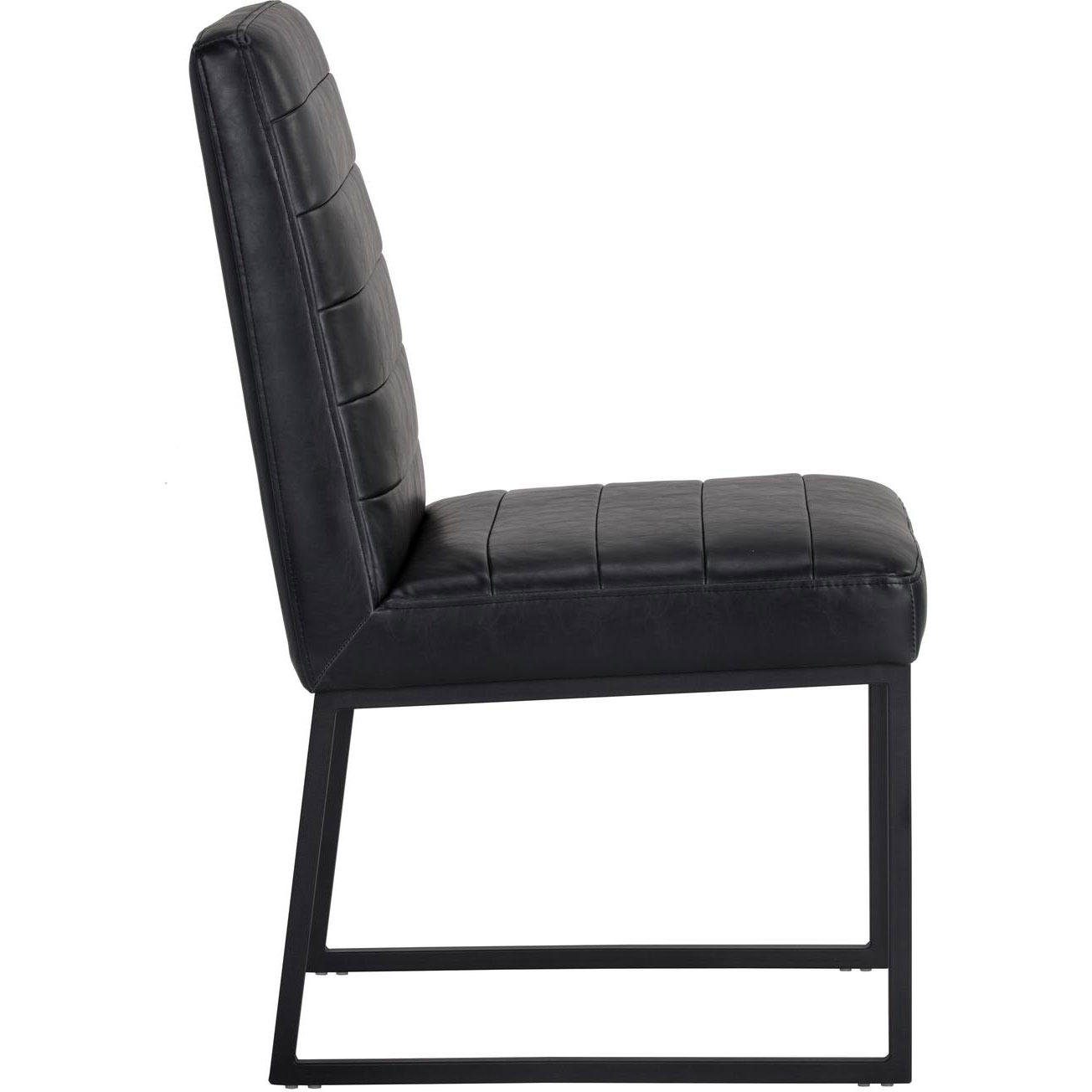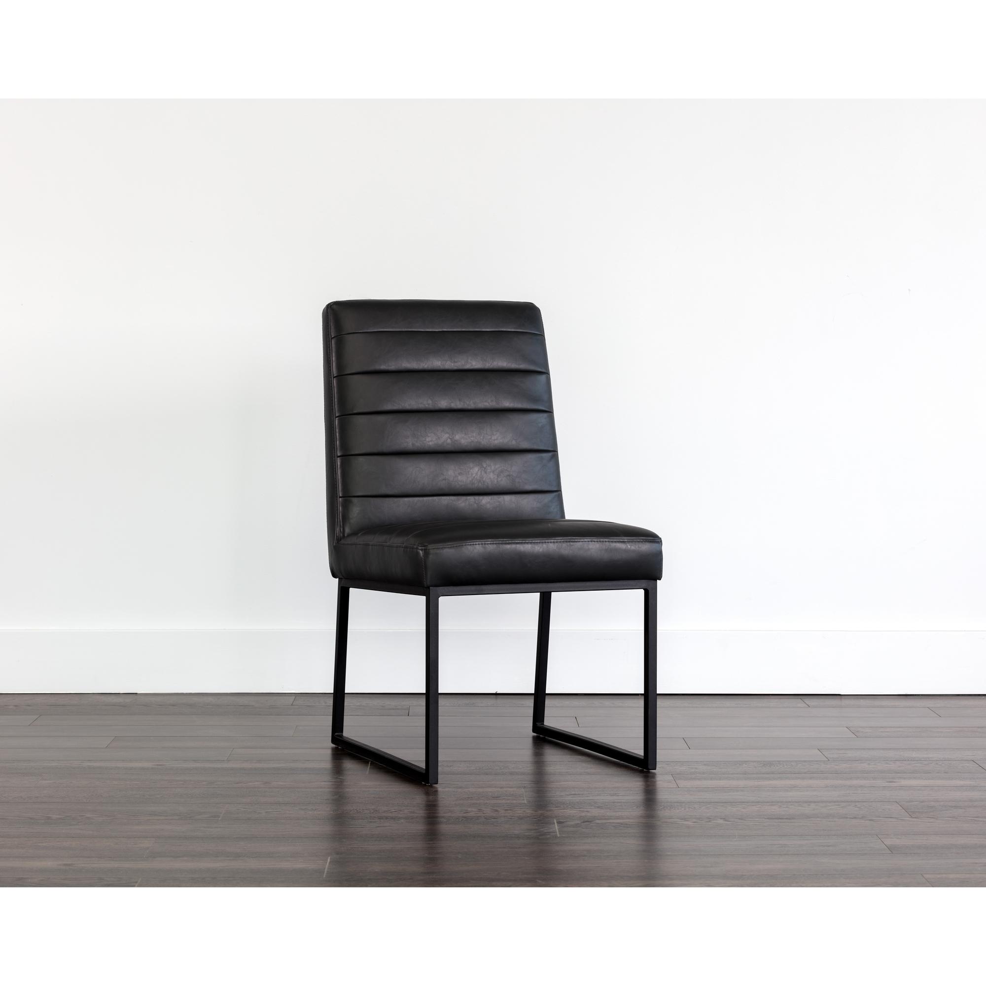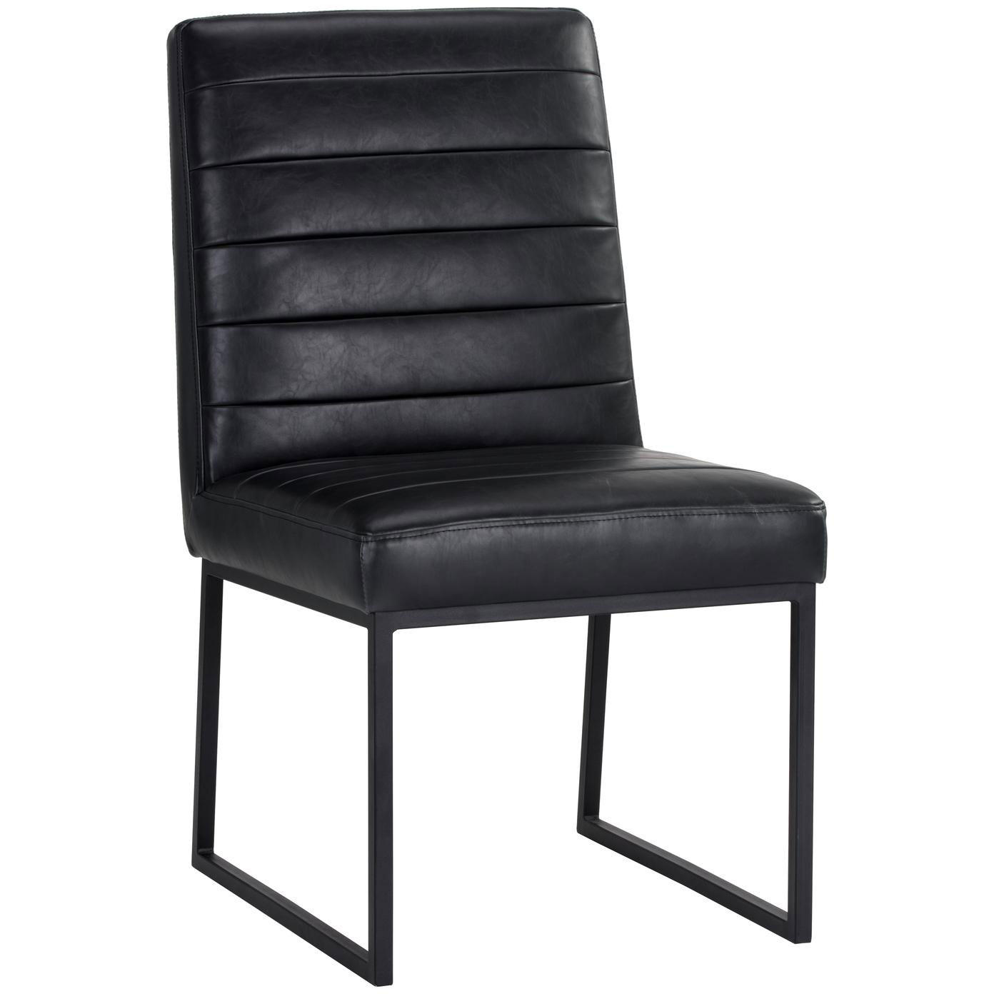 A masculine and modern dining chair. Features horizontal channel tufting on the interior seat and seatback with a sleek black powder-coated steel frame. Stocked in coal black faux leather. Handle With Care: This design has been crafted with faux leather. Faux leather is manufactured to reflect the natural characteristics of leather; as such, colour variations, markings, wrinkles, grooves, and light scratches are appreciated characteristics. No two pieces will be alike. Visit our Product Care page for more information on how to ensure the lasting beauty of this piece.