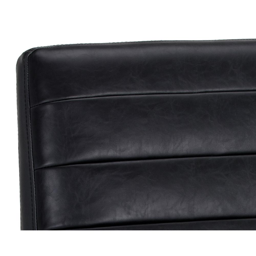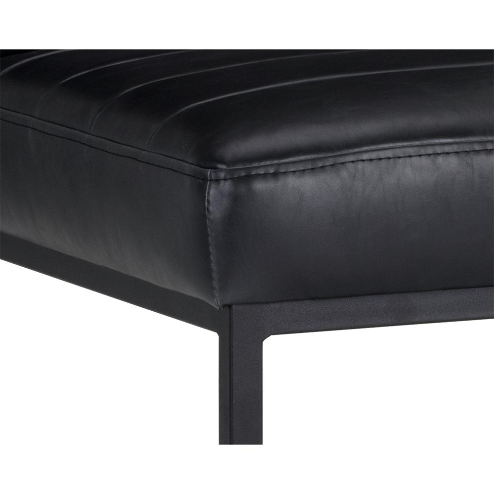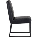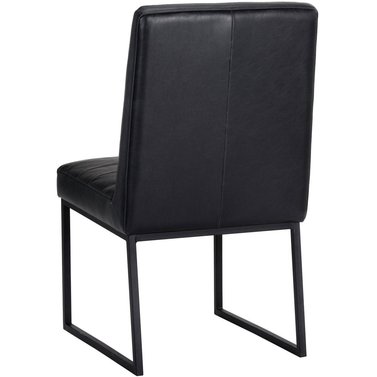 A masculine and modern dining chair. Features horizontal channel tufting on the interior seat and seatback with a sleek black powder-coated steel frame. Stocked in coal black faux leather. Handle With Care: This design has been crafted with faux leather. Faux leather is manufactured to reflect the natural characteristics of leather; as such, colour variations, markings, wrinkles, grooves, and light scratches are appreciated characteristics. No two pieces will be alike. Visit our Product Care page for more information on how to ensure the lasting beauty of this piece.