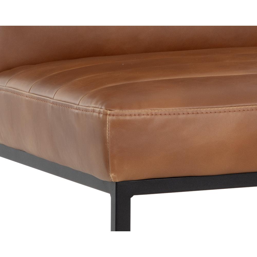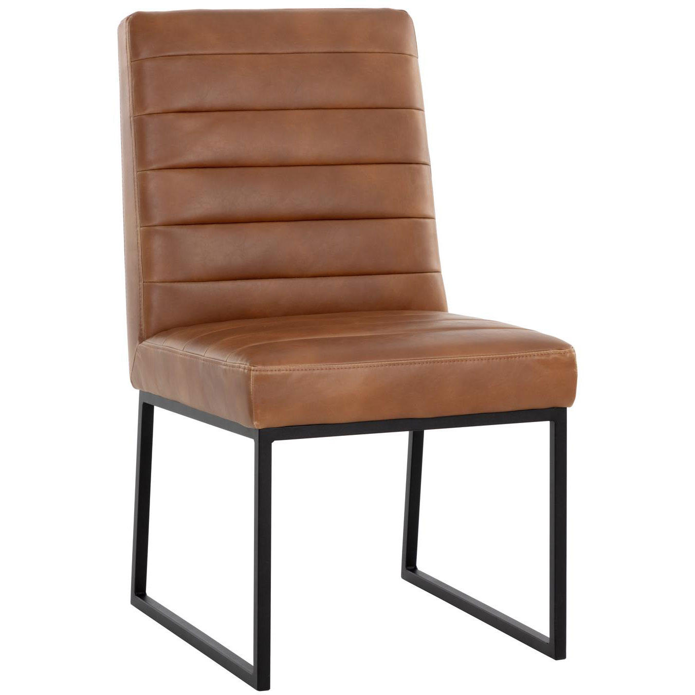 A masculine and modern dining chair. Features horizontal channel tufting on the interior seat and seatback with a sleek black powder coated steel frame. Stocked in coal black, overcast grey and bravo cream and tobacco tan faux leather. Handle With Care: This design has been crafted with faux leather. Faux leather is manufactured to reflect the natural characteristics of leather; as such, colour variations, markings, wrinkles, grooves, and light scratches are appreciated characteristics. No two pieces will be alike.
