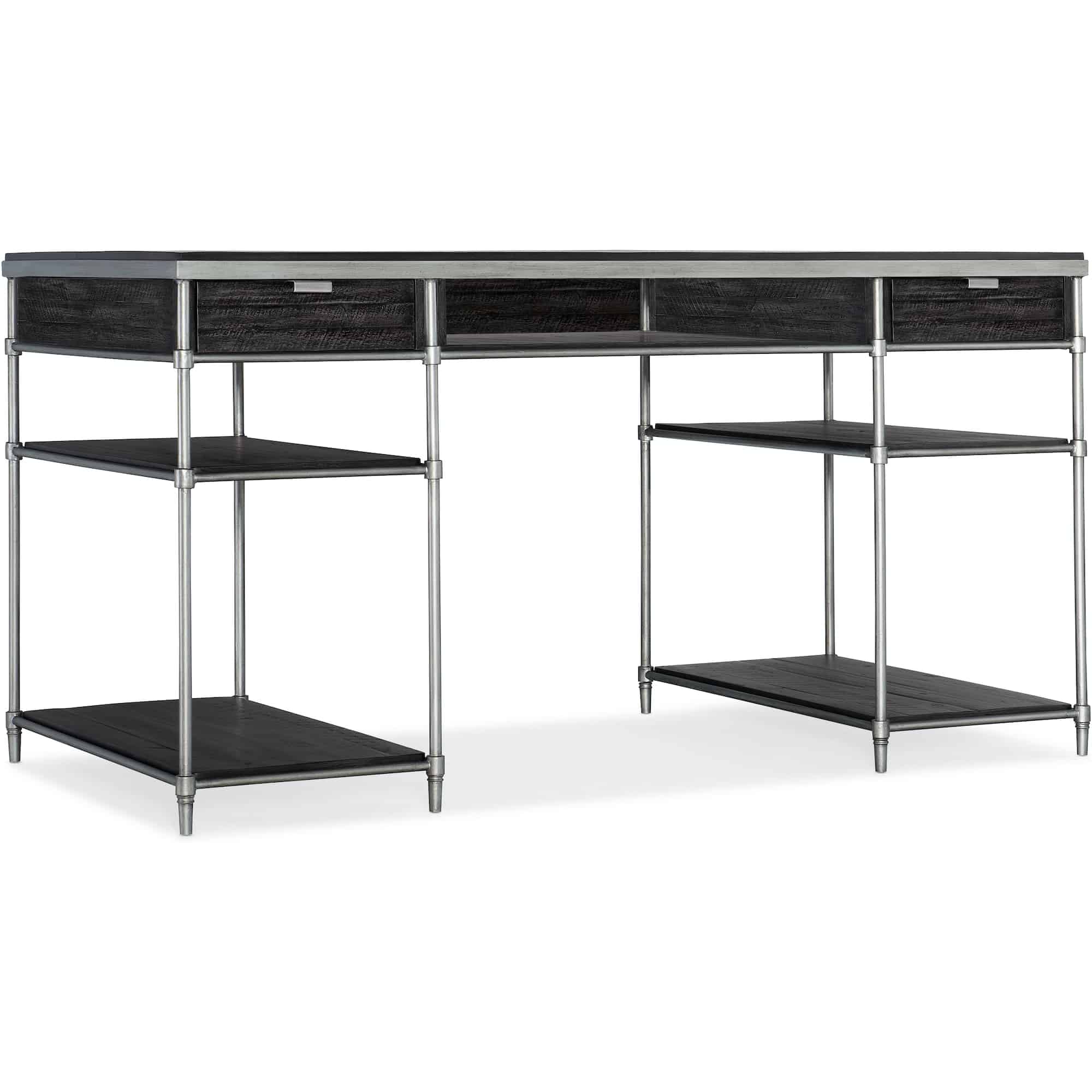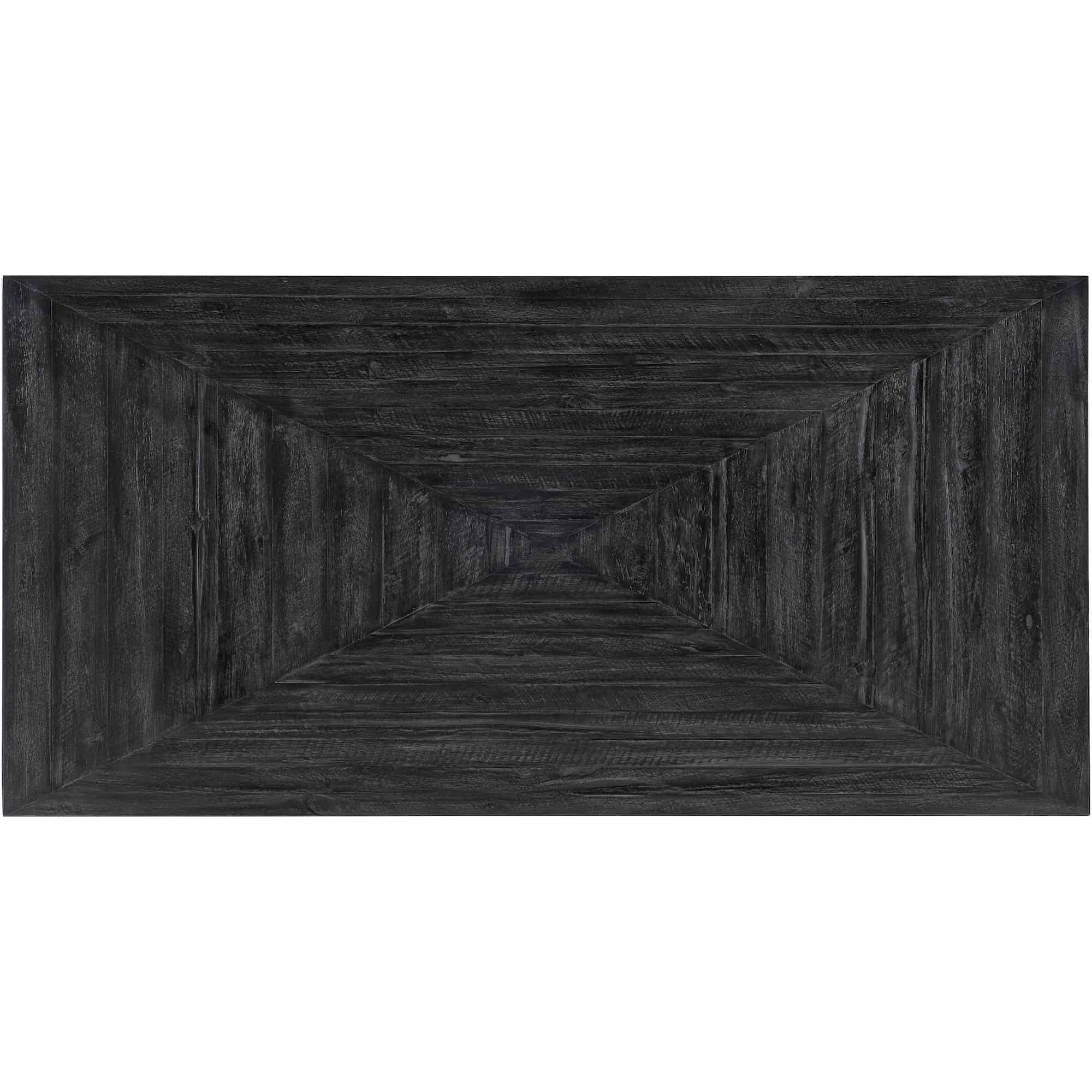 Finish: Black finish with brushed pewter metal and distressing