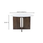 The Stanley dining table features a unique cross base with artfully carved arches at each end that lend an airy feel to its robust construction. Crowned with a solid marble top that showcases natural veining unique to each piece, it offers a durable, smooth surface ideal for daily dining and entertaining. The mango wood base grounds the piece, making it a versatile fit for diverse interior styles.