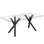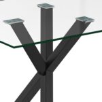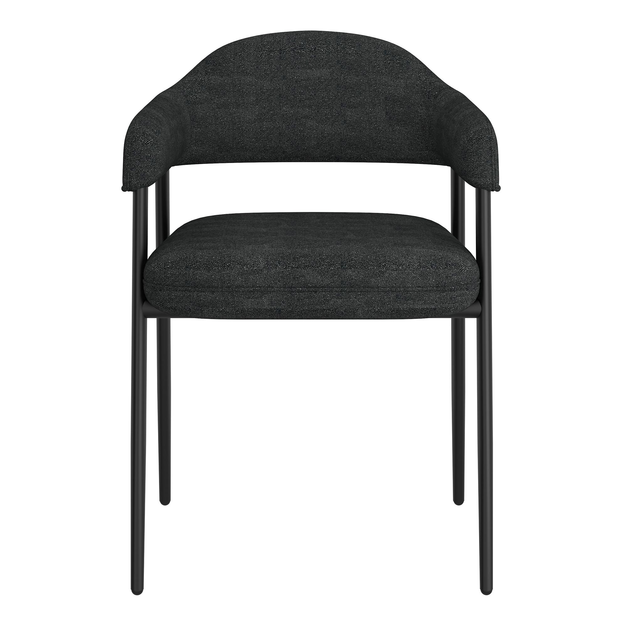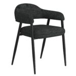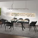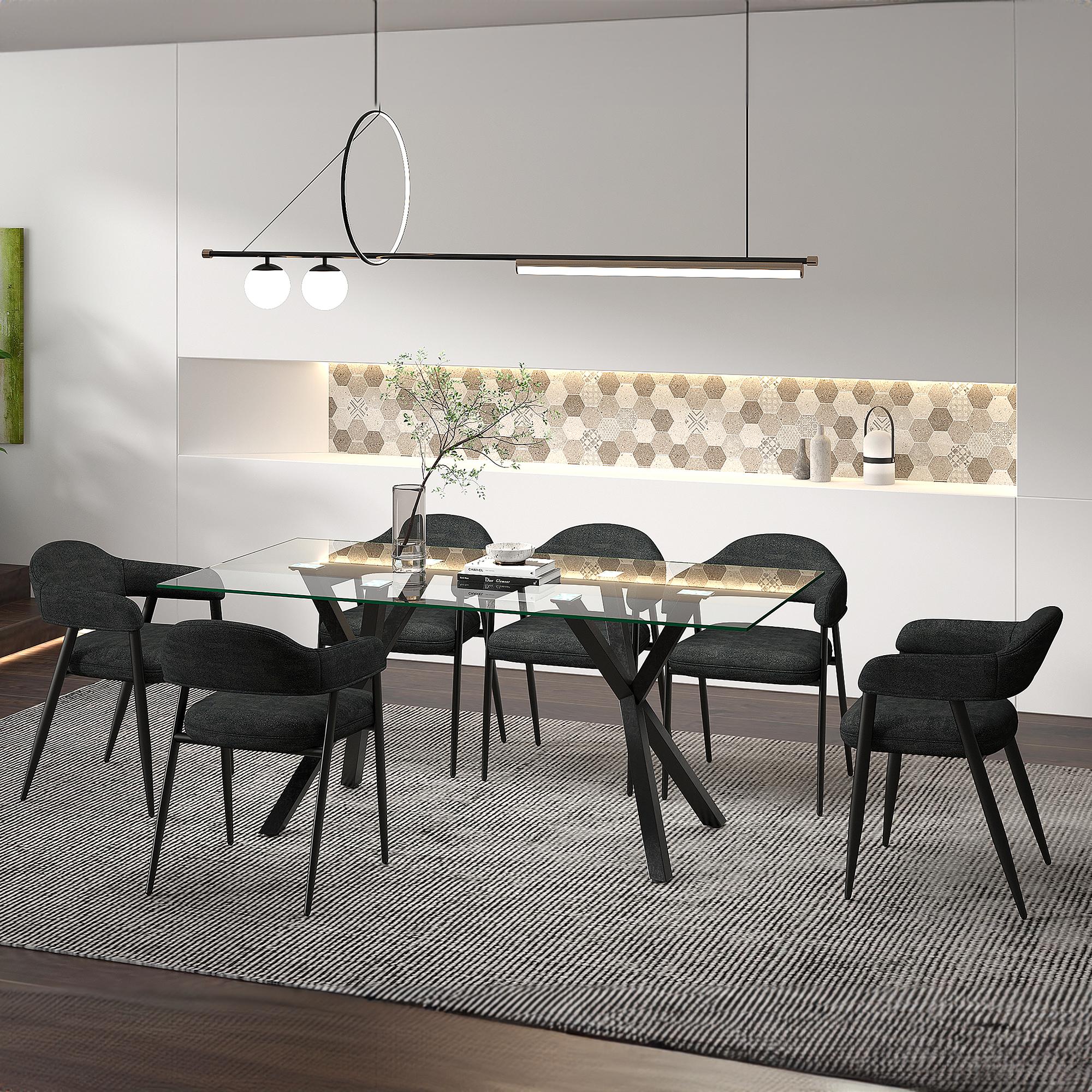 Incorporating a tempered clear glass tabletop on top of metal legs, the fun geometric shape of the base makes this dining table a conversation starter. Detailed with chrome-finished glass holders, this dining table seamlessly blends a visually interesting appearance with a captivating style. This modern dining chair is eye candy for your dining space. The curved back provide high support and comfort and the thick textured fabric is warm and inviting. Sleek black metal legs ensure this chair will work with any style table in any style room.