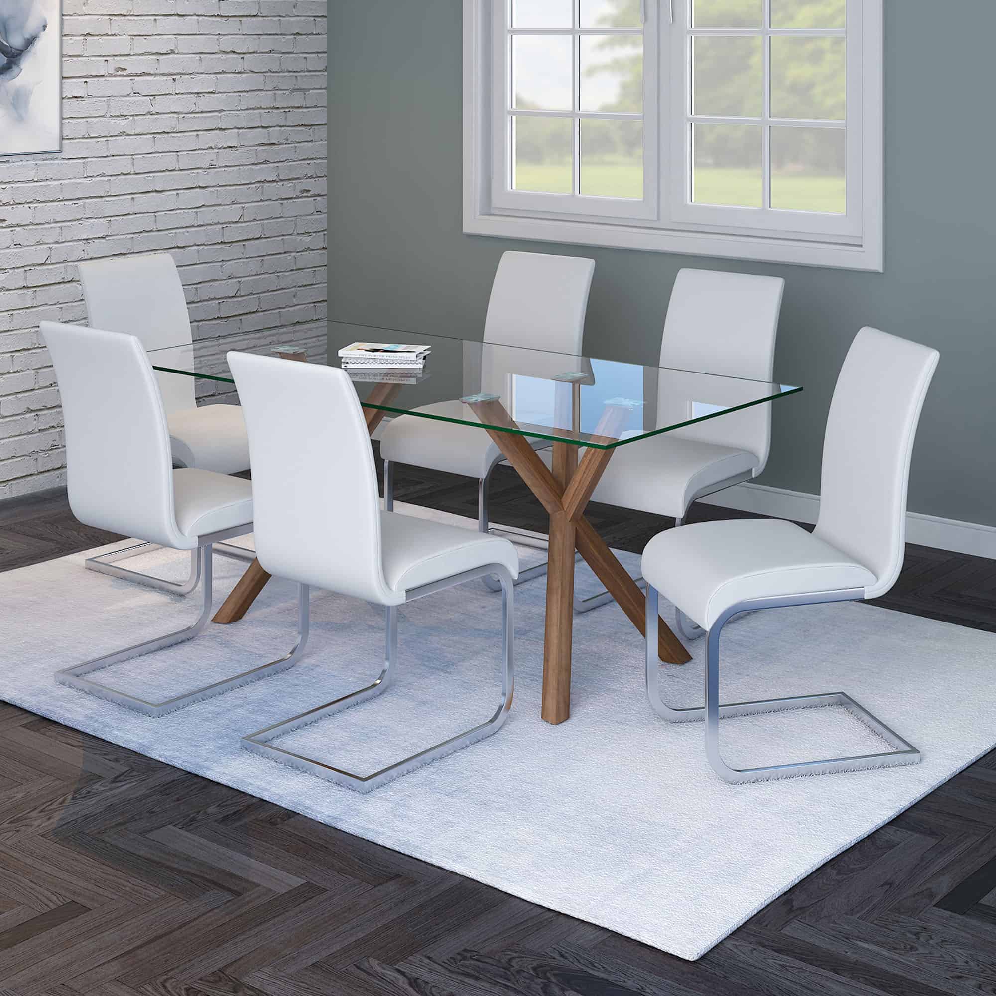 Combining metal and glass elements, this dining table is the perfect match for a variety of different chair styles. Incorporating a tempered clear glass tabletop on top of metal legs, the fun geometric shape of the base makes this piece a conversation starter. Detailed with chrome-finished glass holders, this dining table seamlessly blends a visually interesting appearance with a captivating style. A perfect place to gather for meals, formal or casual.