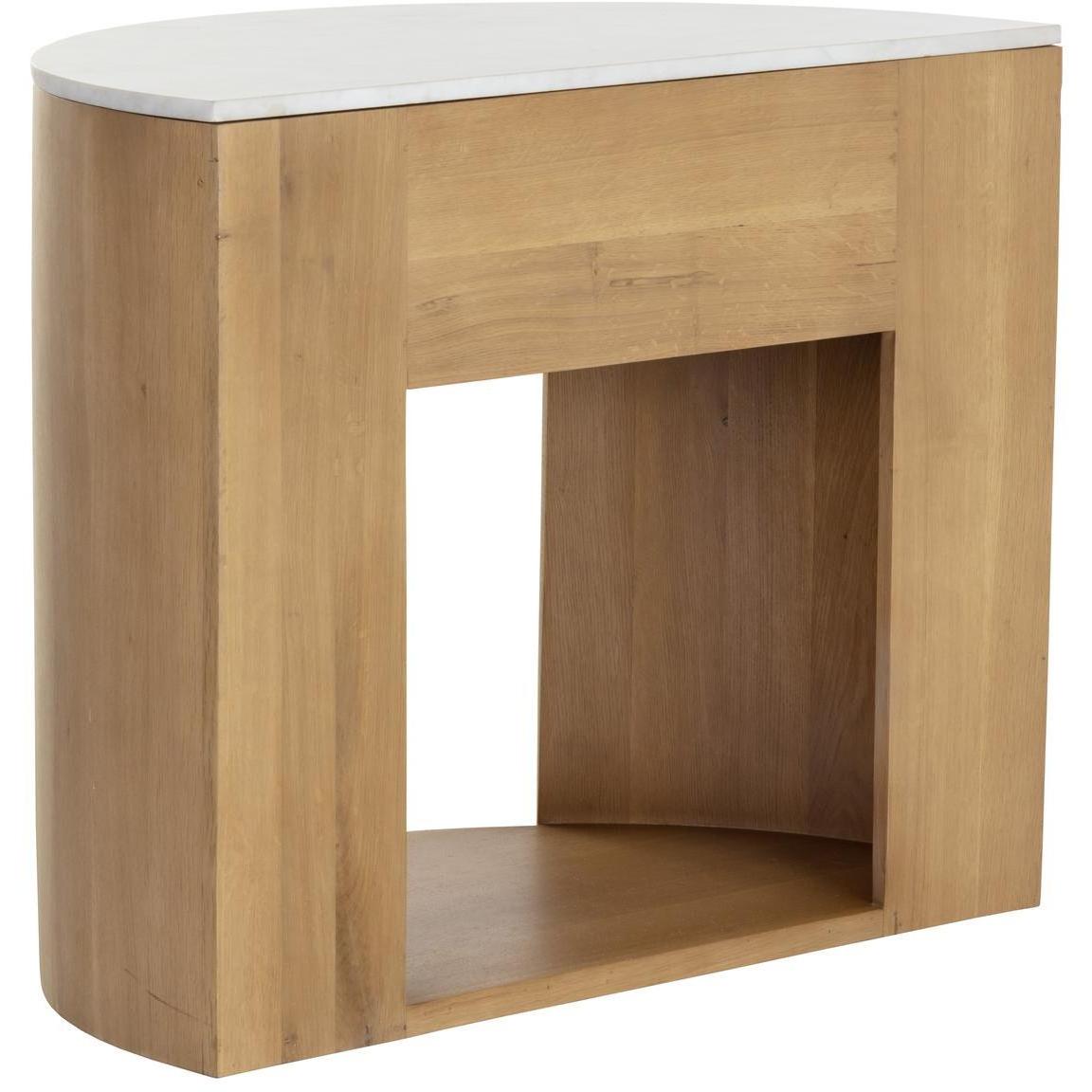 A stylish addition to any space, the Stella Nightstand showcases a stunning display of mixed materials. A smooth white marble table top contrasts beautifully with the rustic oak wood base and drawer. A bottom open shelf provides additional storage room. An antique brass iron handle finishes the design. As marble is a natural material, unique veining, pitting, fissures, micro-cracks and colour variations are all characteristics that add to the uniqueness and beauty of each piece. As wood is an organic, porous material, these pieces will contain natural variation of texture and may also exhibit fine indentations and cracks. Wood pieces will also display a disparity of colour and grain, and visible knots and burls that add to the character of each piece. Made in India. With refined craftsmanship, this design was brought to life by skilled local artisans. Due to the nature of handcraftsmanship, unique imperfections such as fissures, markings and variations in colour and shape are welcomed and appreciated characteristics for a truly one-of-a-kind piece.