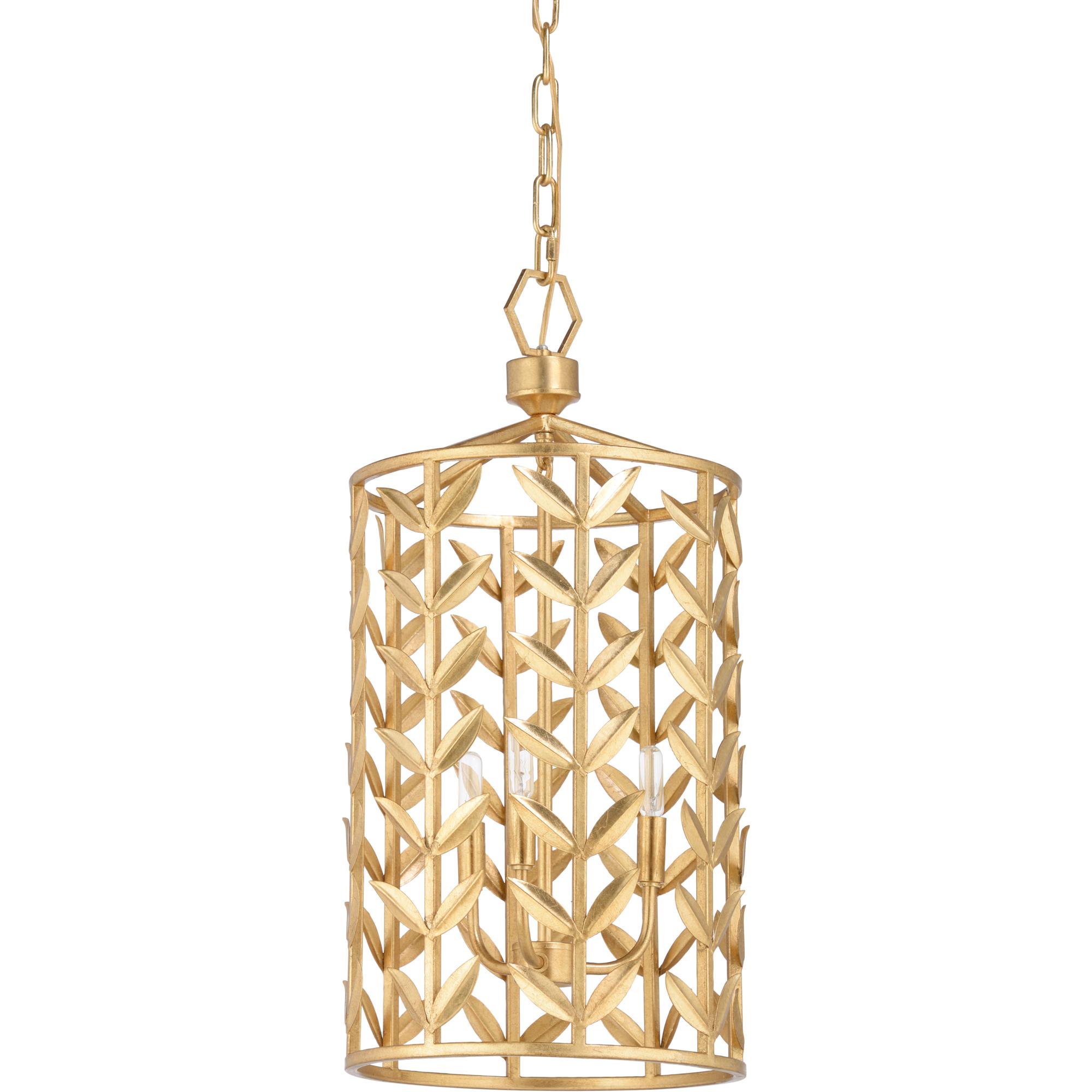 Open metal work lantern featuring stem and leaf detail in gold leaf. Comes with six feet of chain. Designed by Claire Bell.