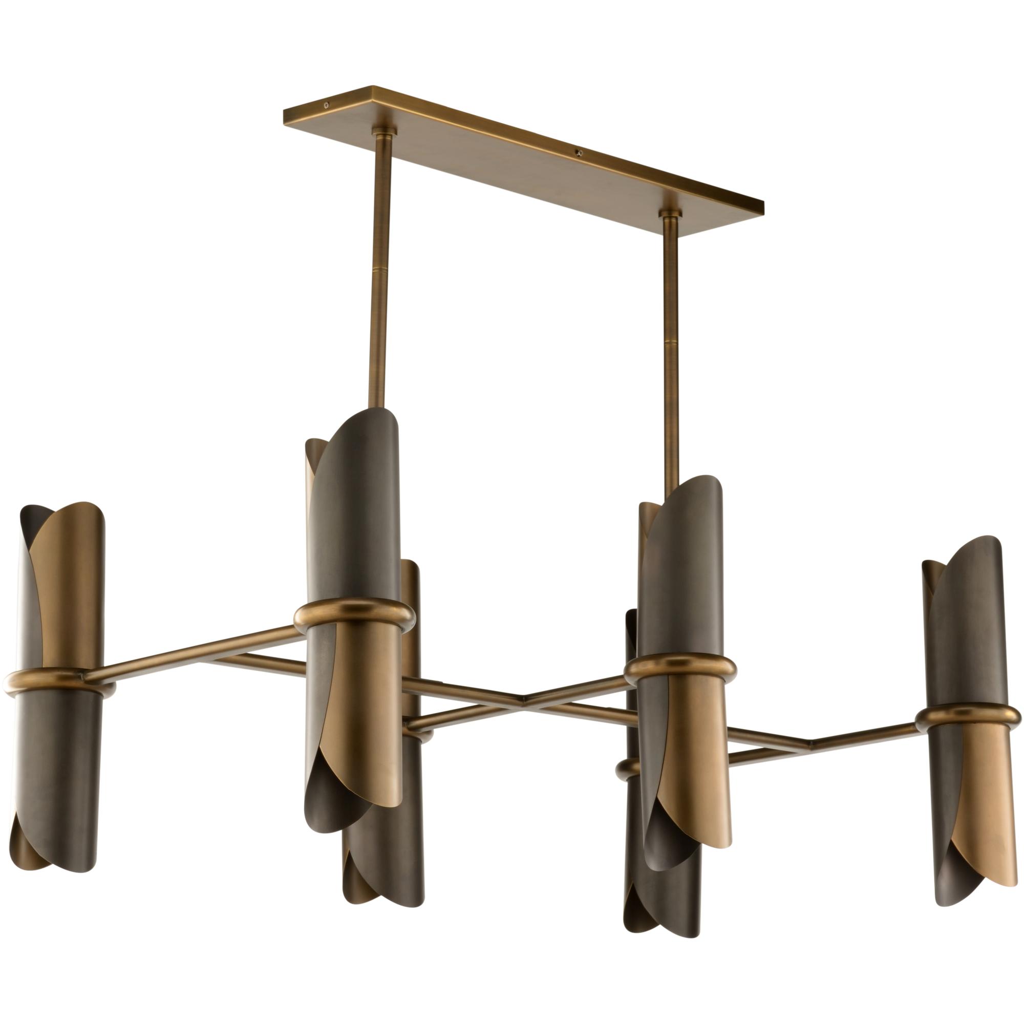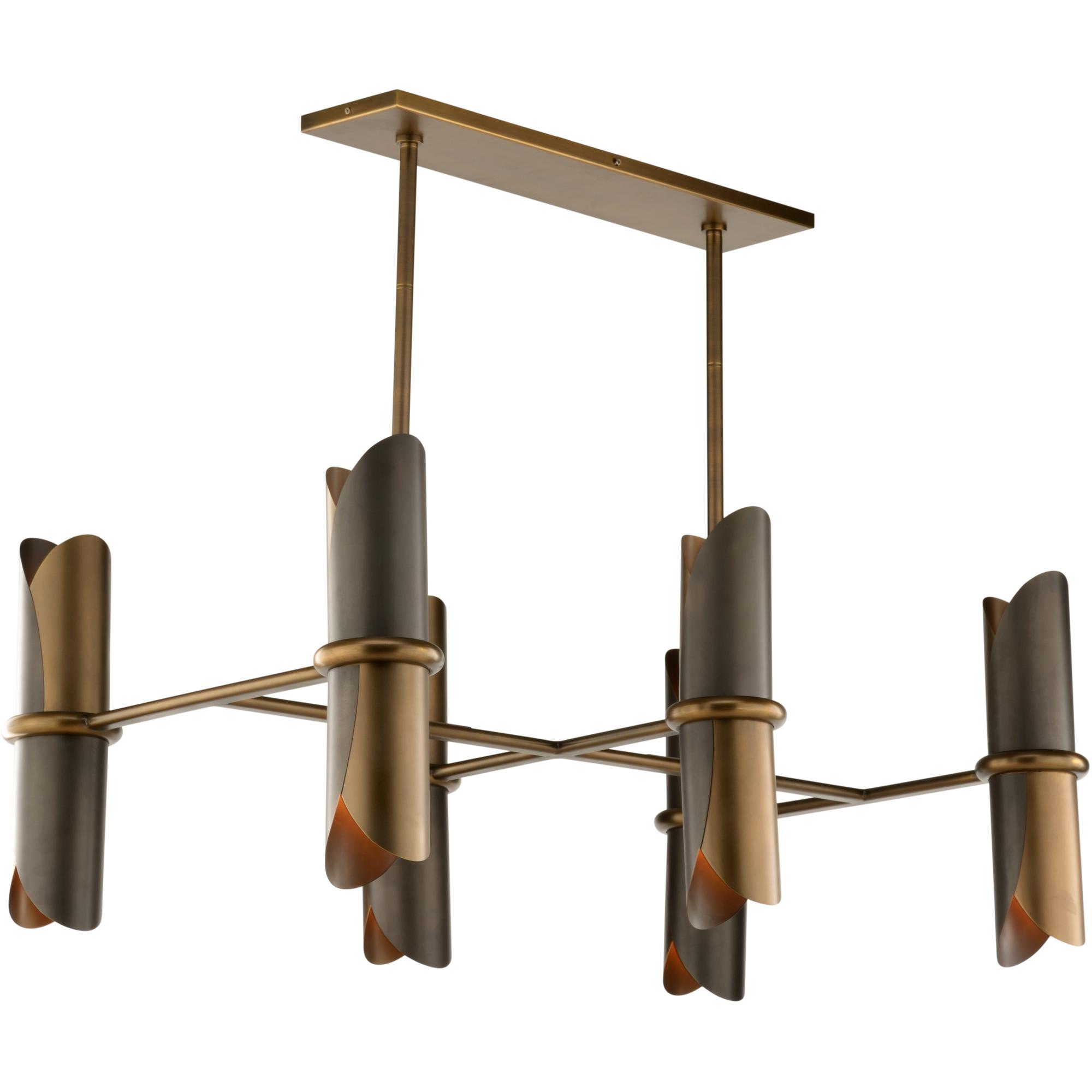 Contrasting cylindrical brass and bronze petals provide dual illumination of ceiling and floor to create drama in a space. Raw yet refined, the Stockman Chandelier is designed for placement over dining tables, billiards tables, kitchen islands, or any space that calls for a statement. (Comes with (2) 6″ and (6) 12″ rods)(Canopy measures 25.5″W x 6″D x 1″H)
