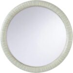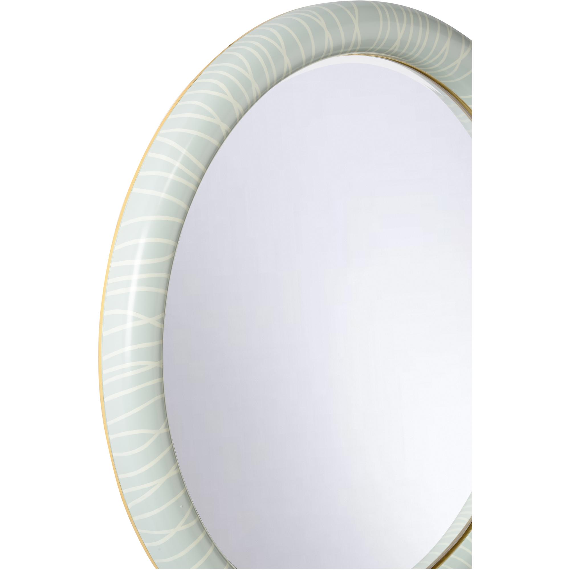 The String Along Mirror is a striking, round piece featuring a bold blue-and-white painted design on its wood frame. With its large size and modern pattern, this mirror adds a stylish focal point to any room, blending contemporary art with functional elegance. Designed by Shayla Copas.