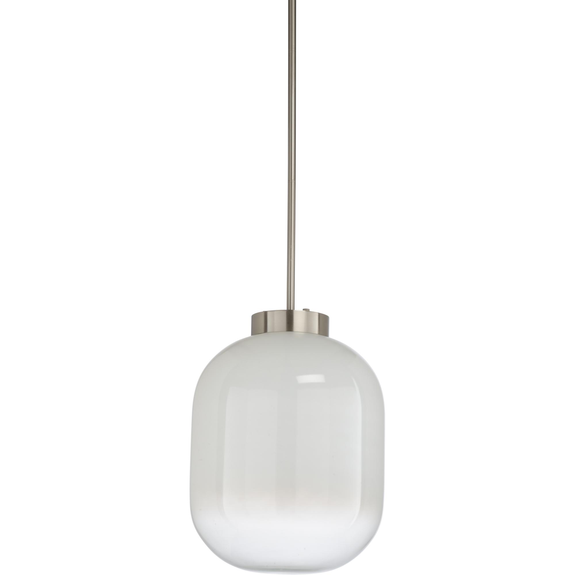 Vintage inspired milk glass globe pendant with a brushed nickel finish. Comes with 1-6″ extention rod and 3-12″ extention rods.