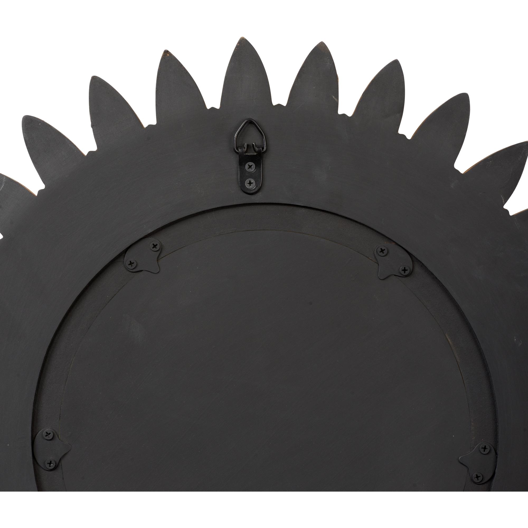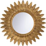 Radiating warmth and charm, this round wood mirror evokes the beauty of a sunflower with its sculpted, petal-like frame finished in antique gold. The organic form and rich detailing bring a touch of vintage elegance.