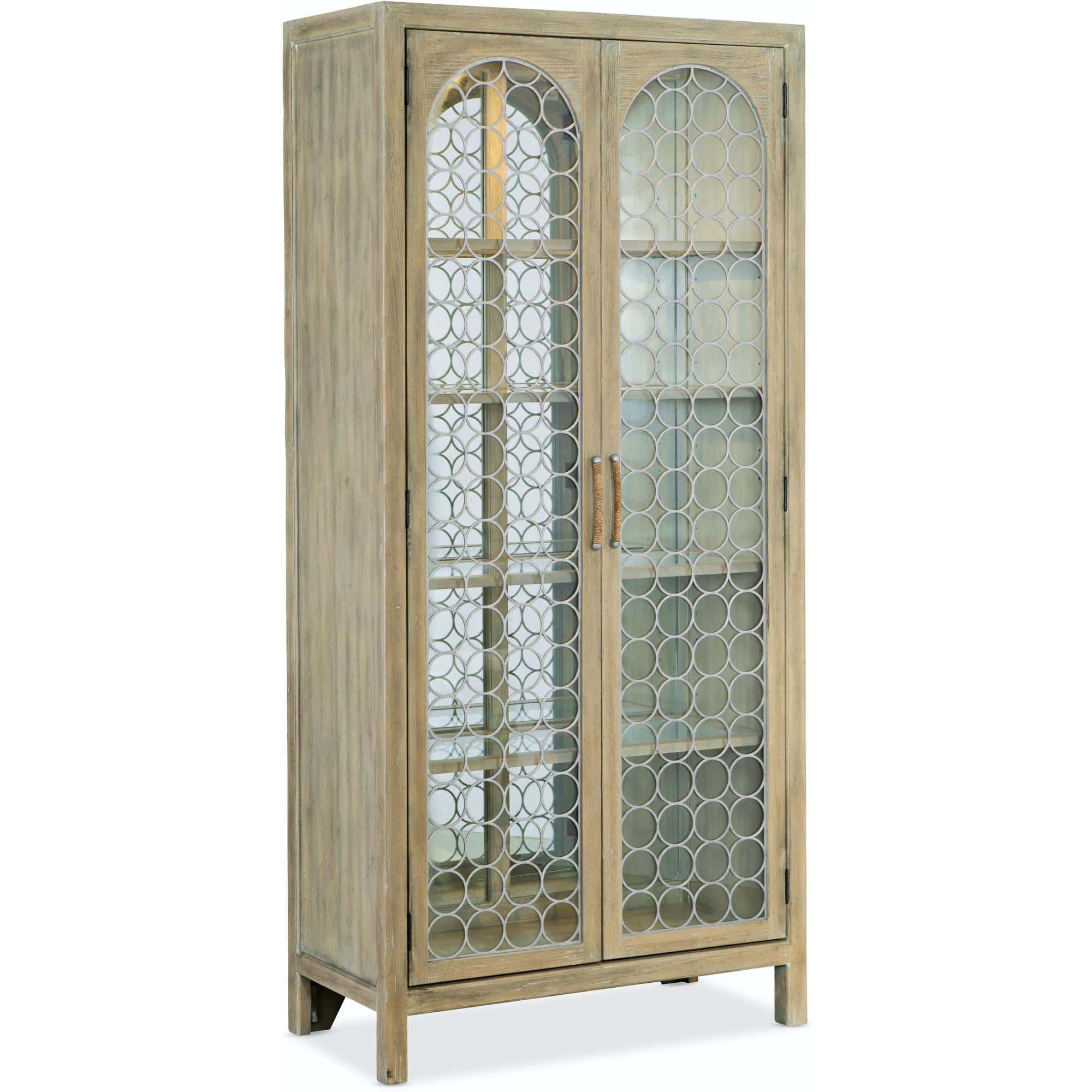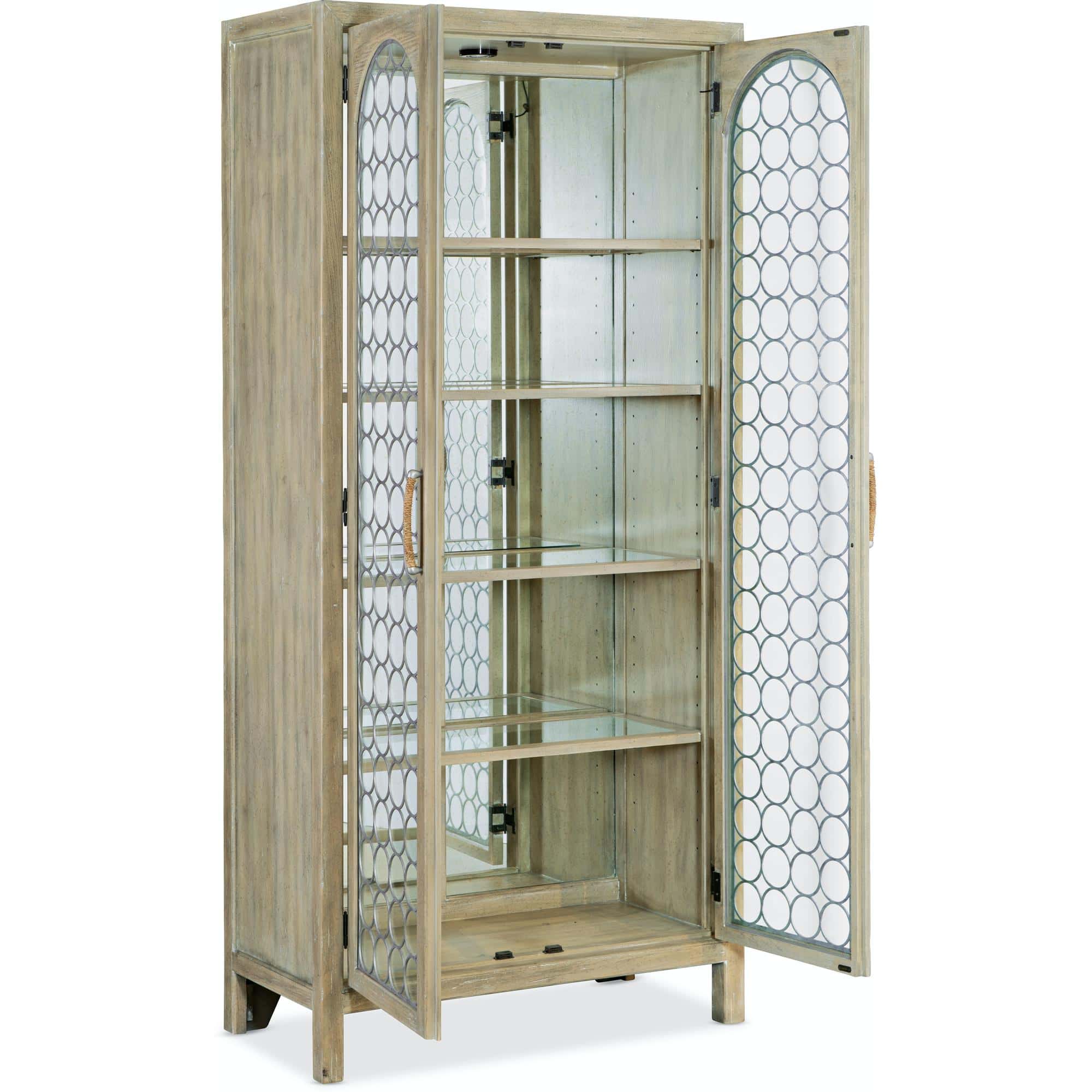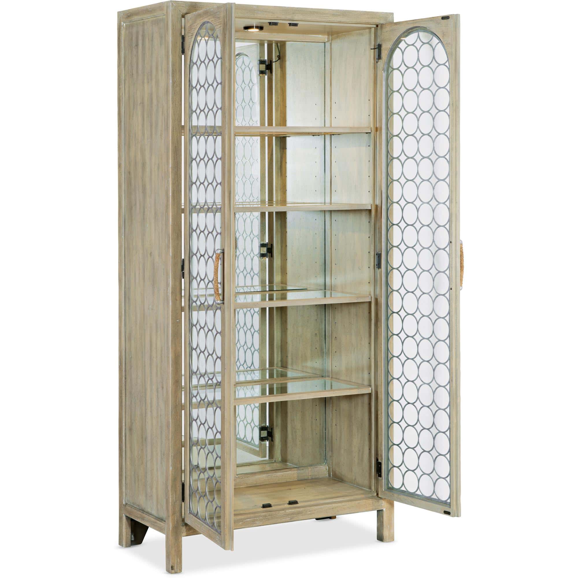 Finish: Driftwood: a light, natural finish. Distressing includes sandblasting, bleaching, drawknife and wormholes. Bar pulls with rope and silver-colored metal.