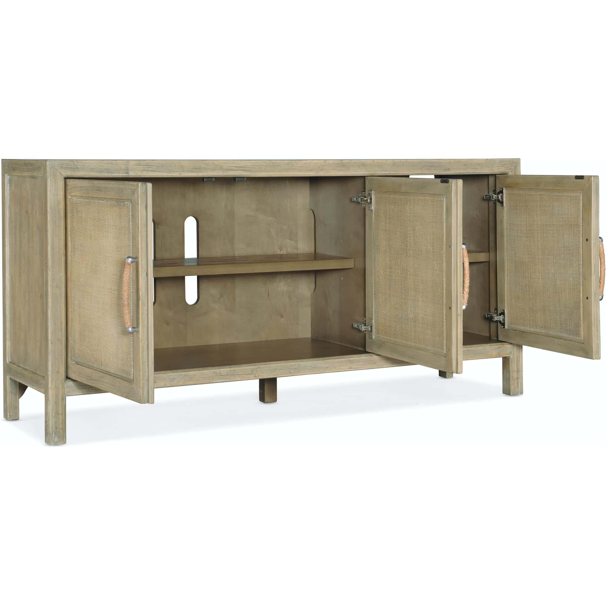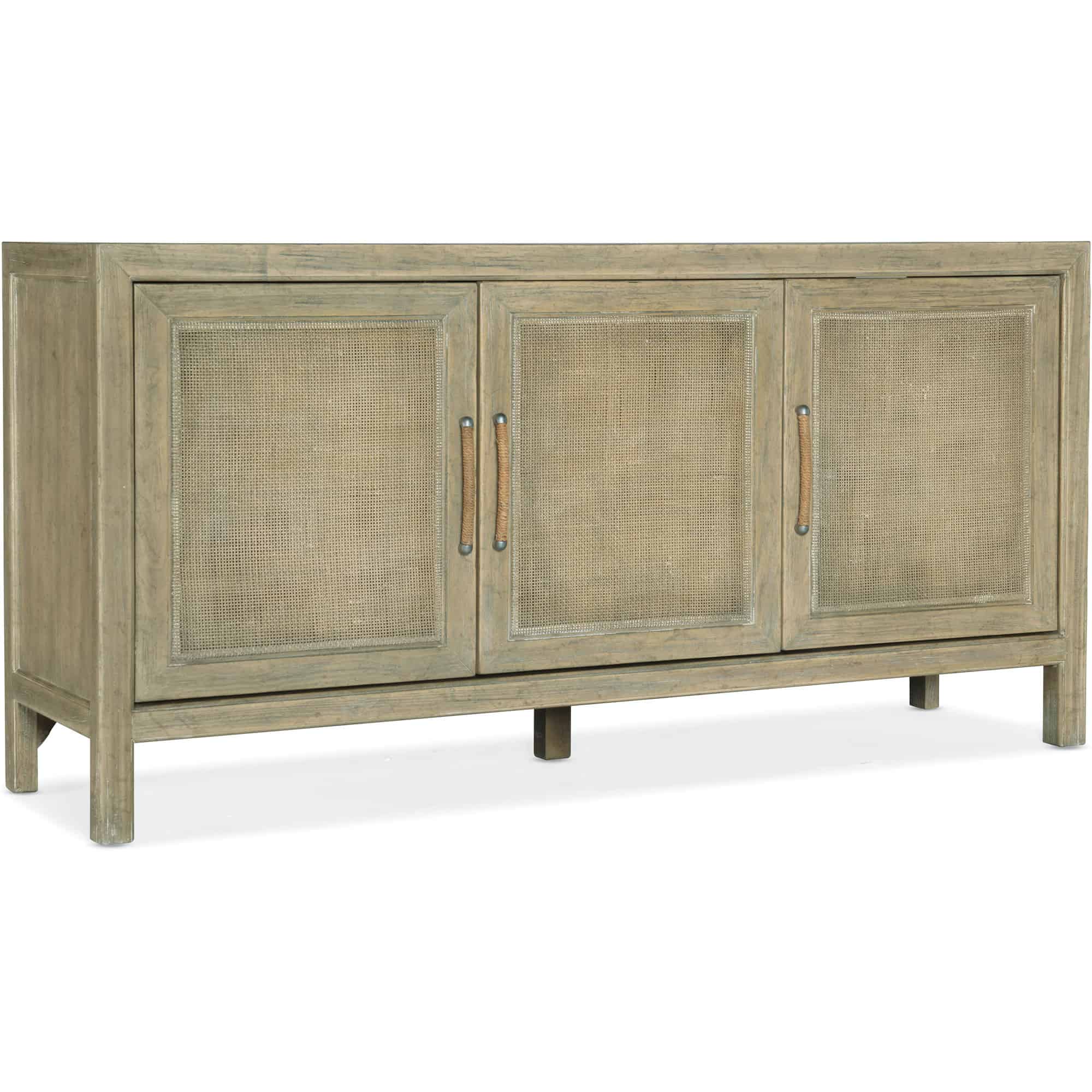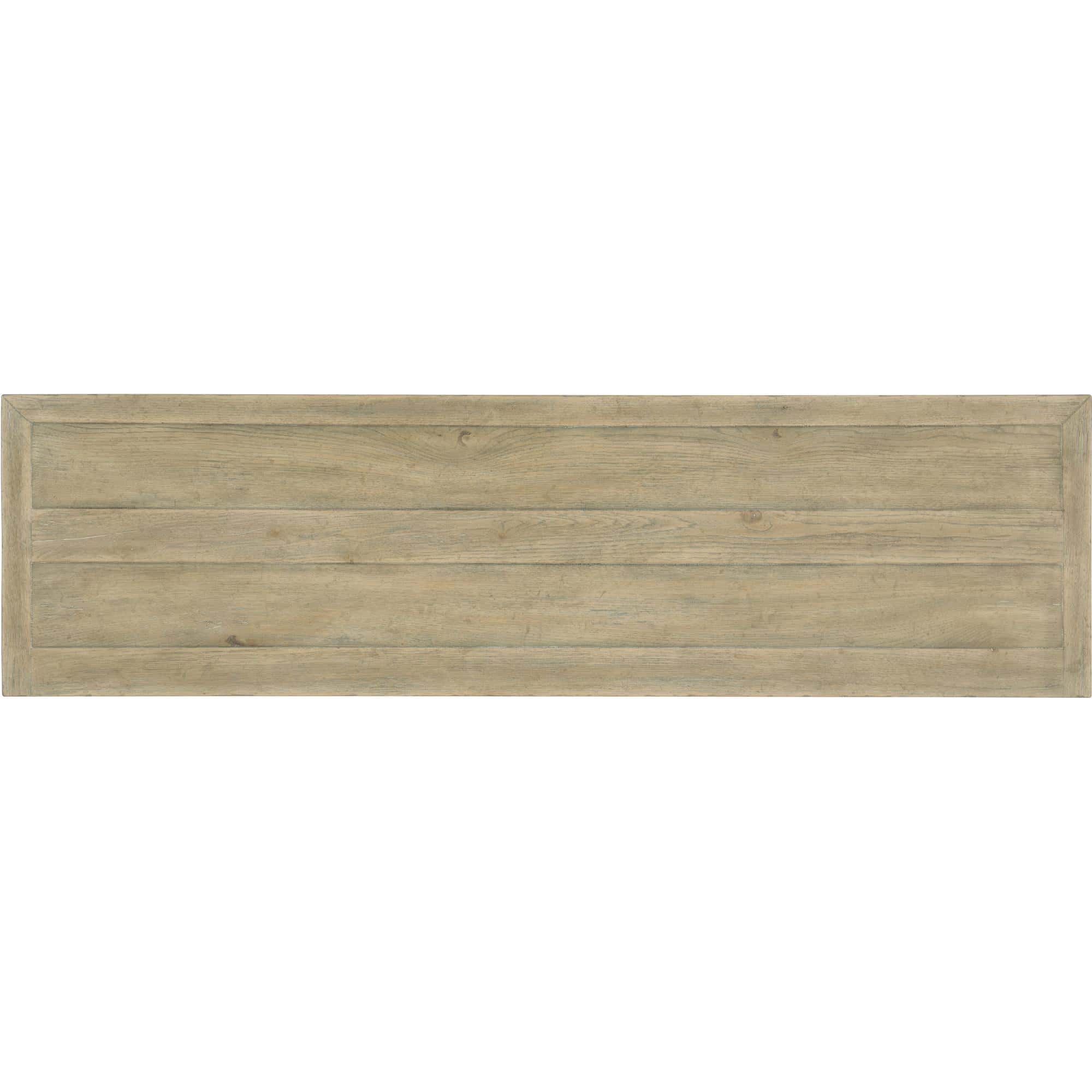 Finish: Driftwood: a light, natural finish. Distressing includes sandblasting, bleaching, drawknife and wormholes. Bar pulls with rope and silver-colored metal.