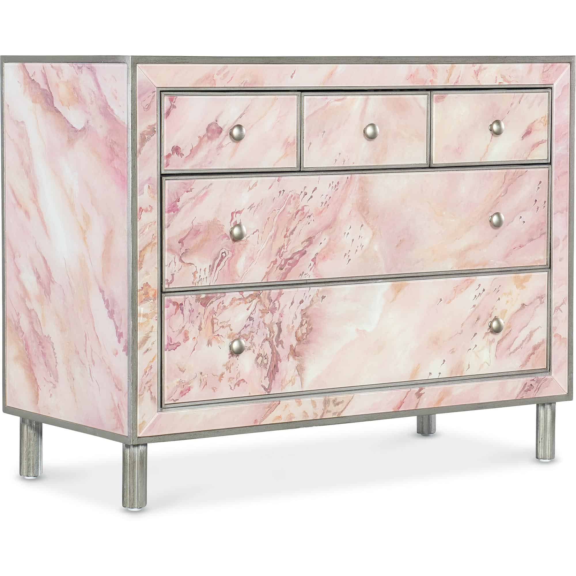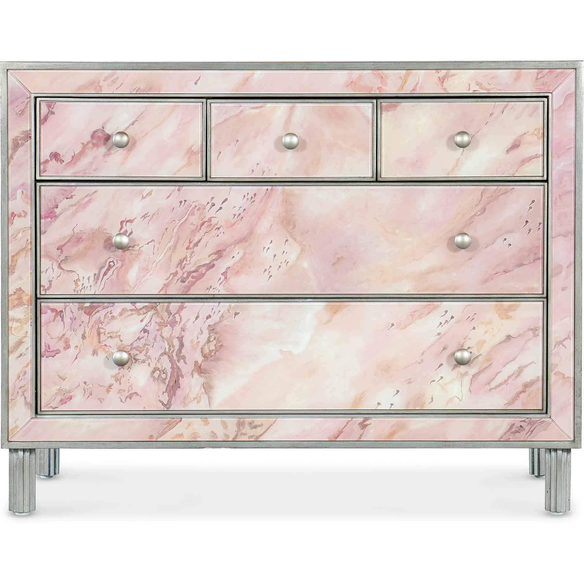- Finish: Reverse handpainted glass in pink colors with silver legs and frame and silver finished round metal knob hardware