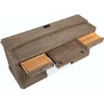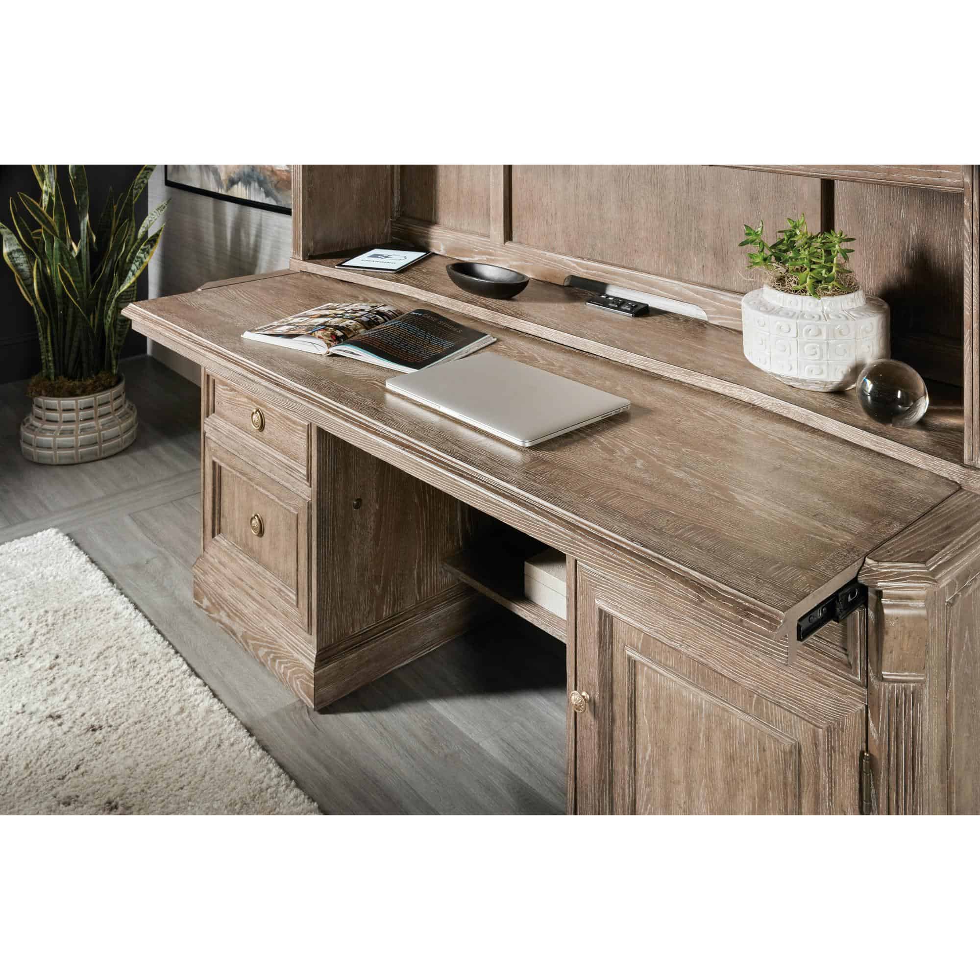 Center drawer has a drop-front and cutout for wire management for keyboard use