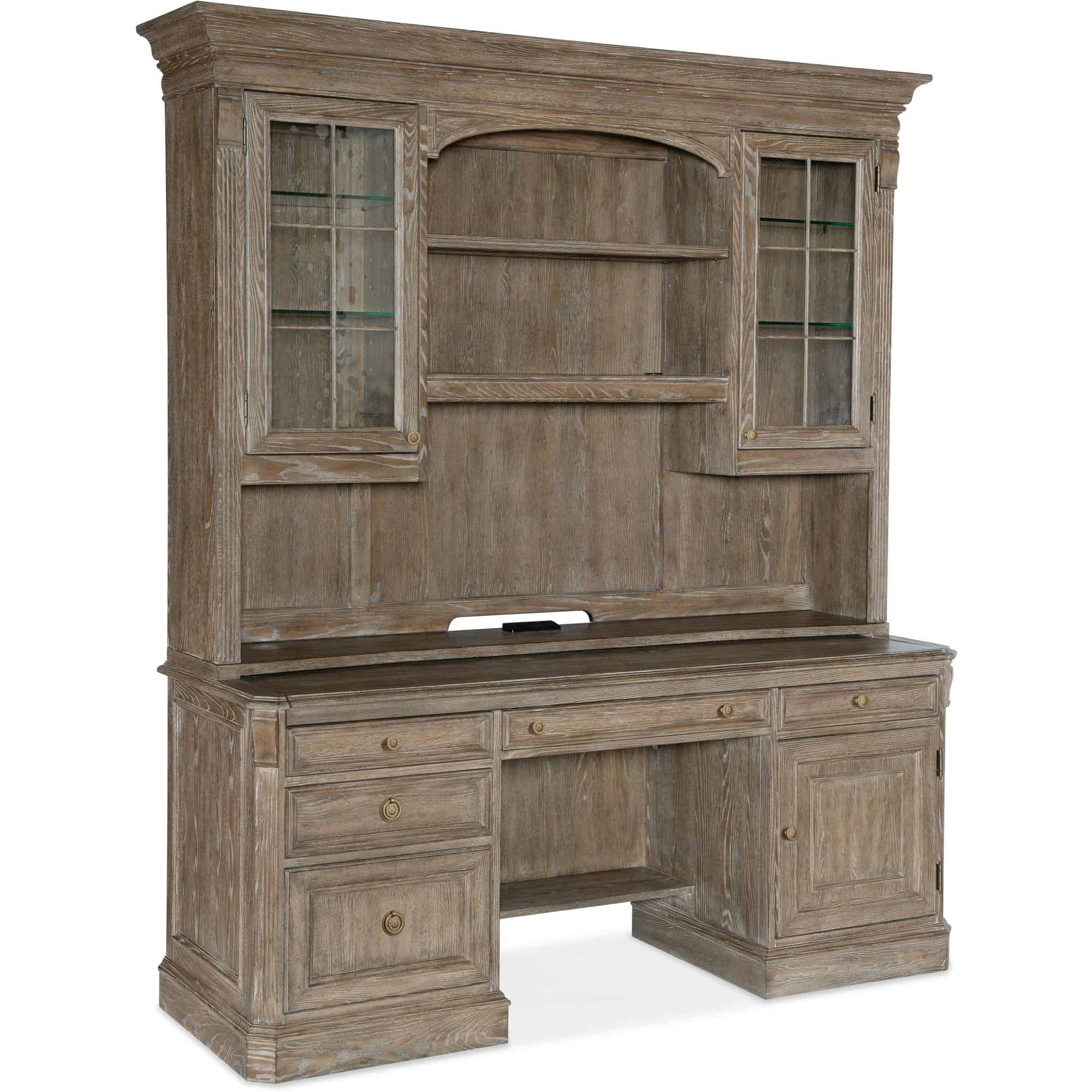 Finish: Claro, a distressed medium clear oak finish with champagne colored knobs