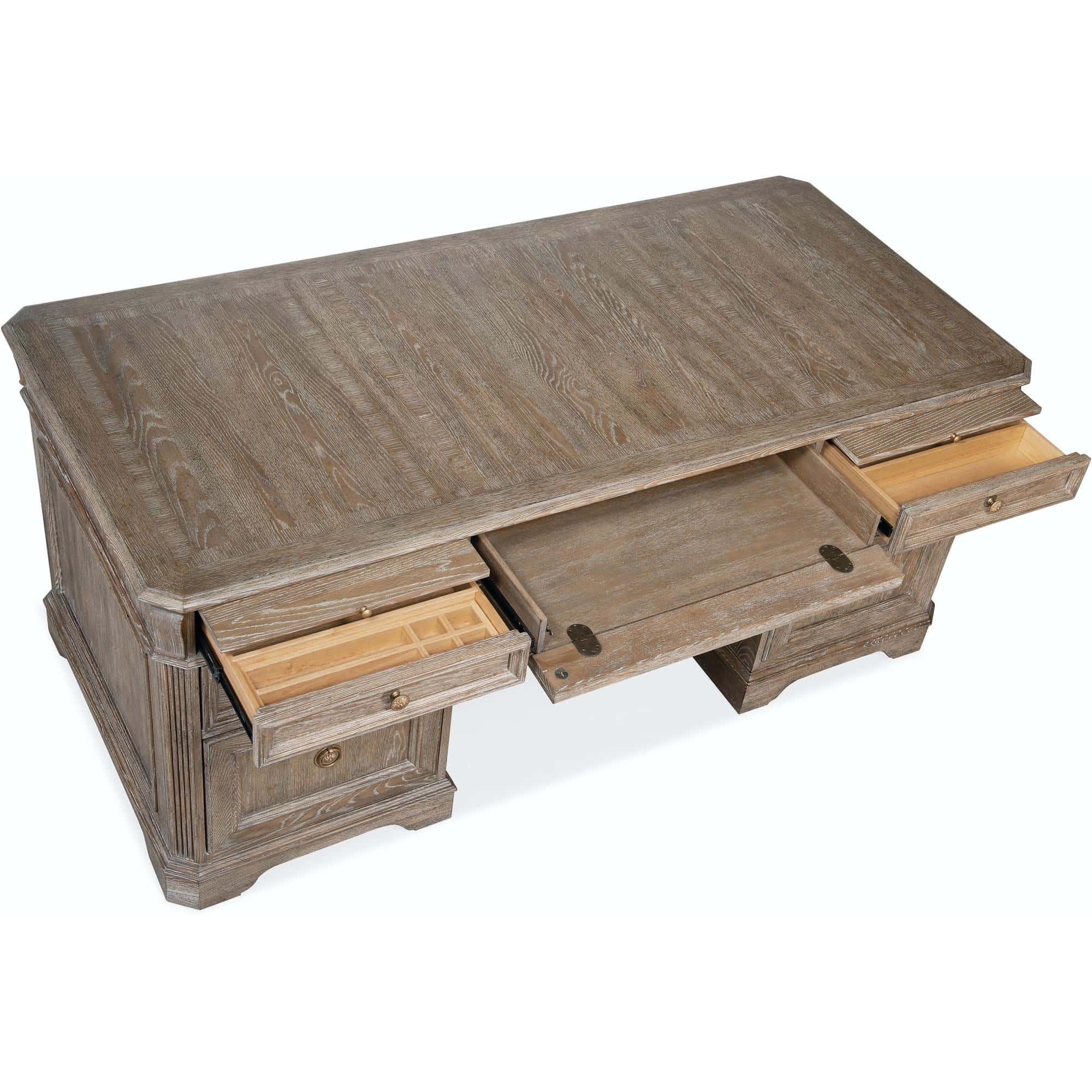 Top left and right drawers are on 100lb full extension metal ball bearing slides with removable divider inserts and one removable pencil drop-in that can be used on either side
