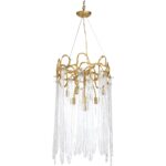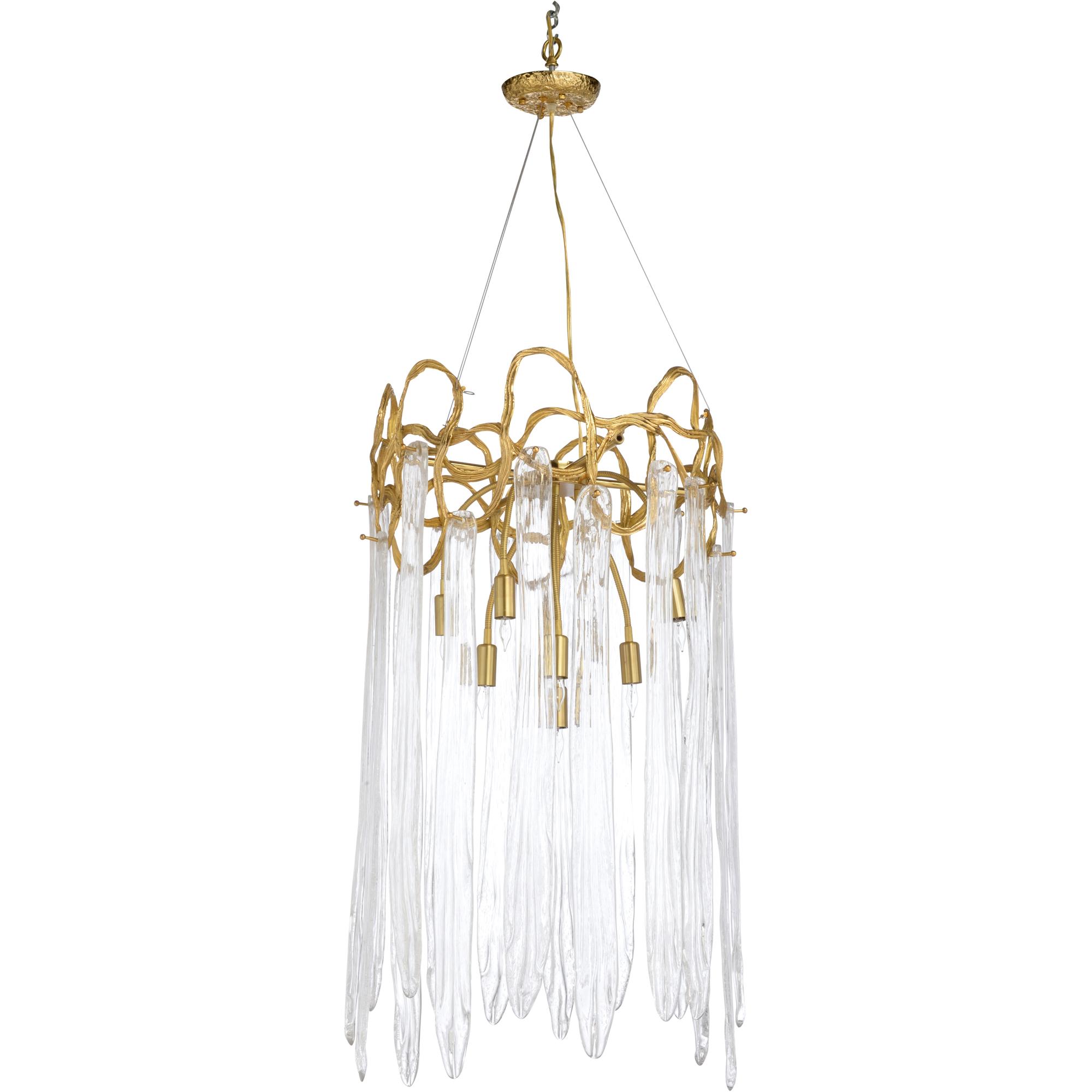 Flowing brass chandelier with glass drop accents. Nine lights.