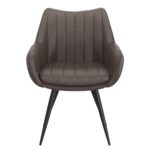 The return-swivel on this chair will kick up the design value of your space with every seated experience. Great as a dining chair, or as an accent piece in the living room or in a bedroom. The welded metal legs provide sturdy support and the contoured seat is comfortable and inviting. Faux leather upholstery is easy to wipe clean and the vintage finish adds a level of warmth. Warm, earthy tones and black metal legs combine to create the perfect modern boho-chic armchair.