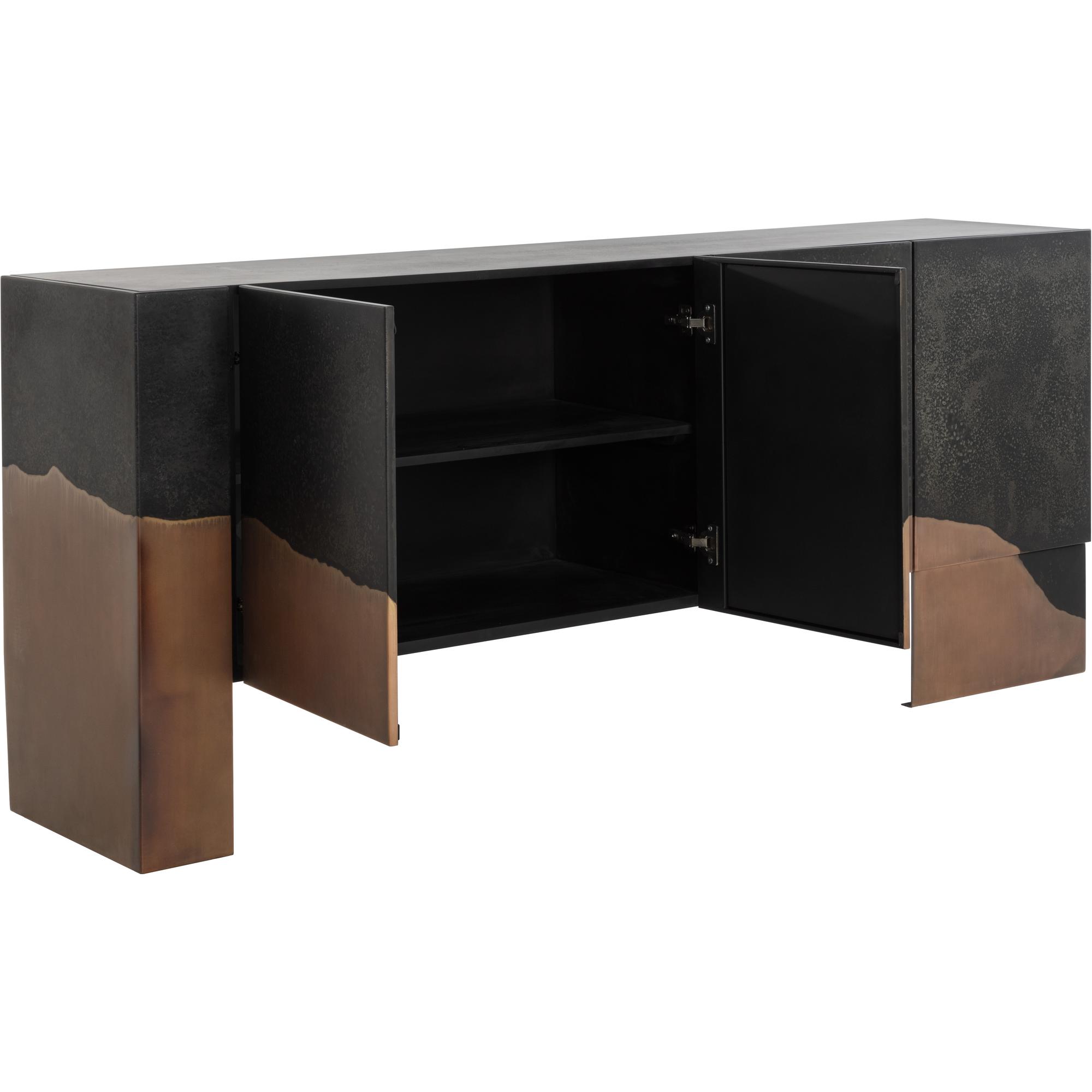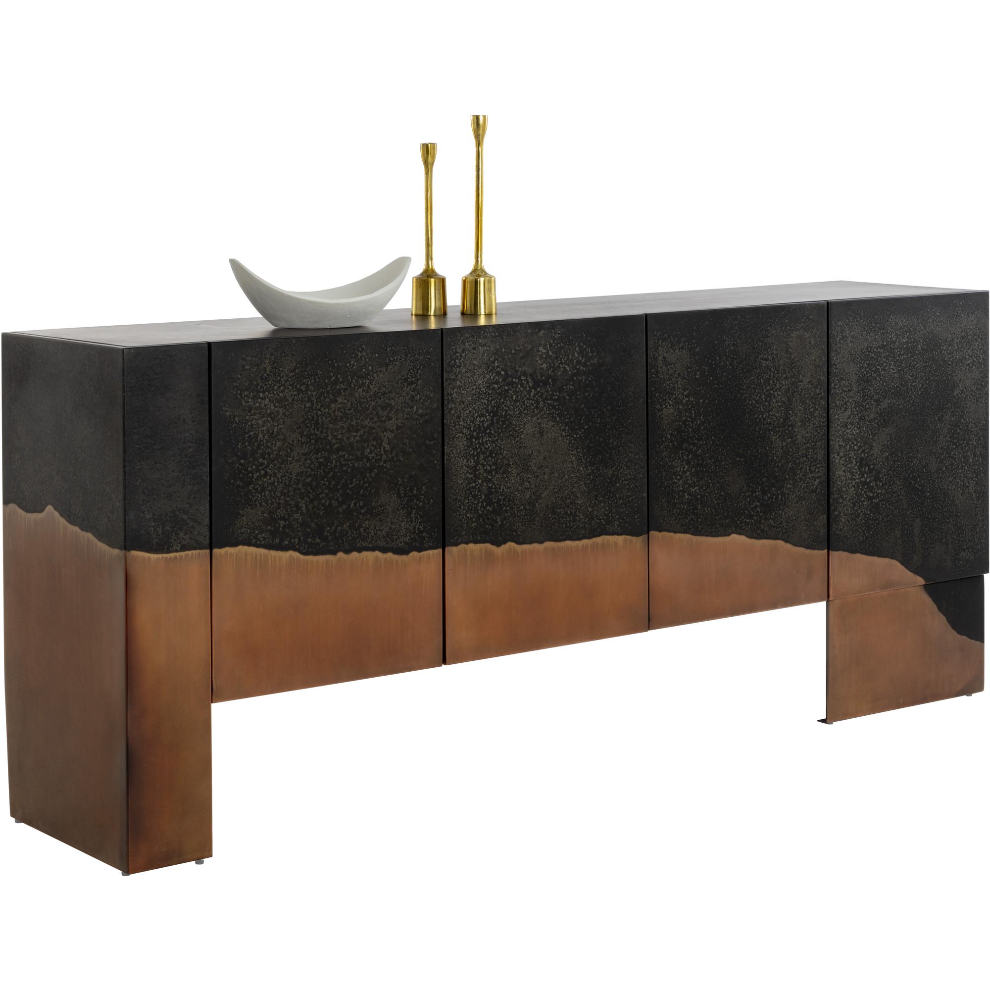 Strikingly beautiful, the Tapio Sideboard unites international style and unique materials to create a masterful piece that will serve any space beautifully. The organic appeal of solid mango wood and rich tonal variations of the powder-coated copper and zinc iron patina add to its one-of-a-kind charm.