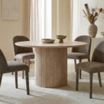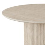 This statement piece will be the centre of attention in your home. The reeded finish on the pedestal is perfectly topped with a sintered stone top creating a refined piece that will elevate your carefully designed dining space. The tone-on-tone travertine finish is an easy match to various chair styles and colours.
