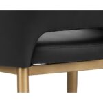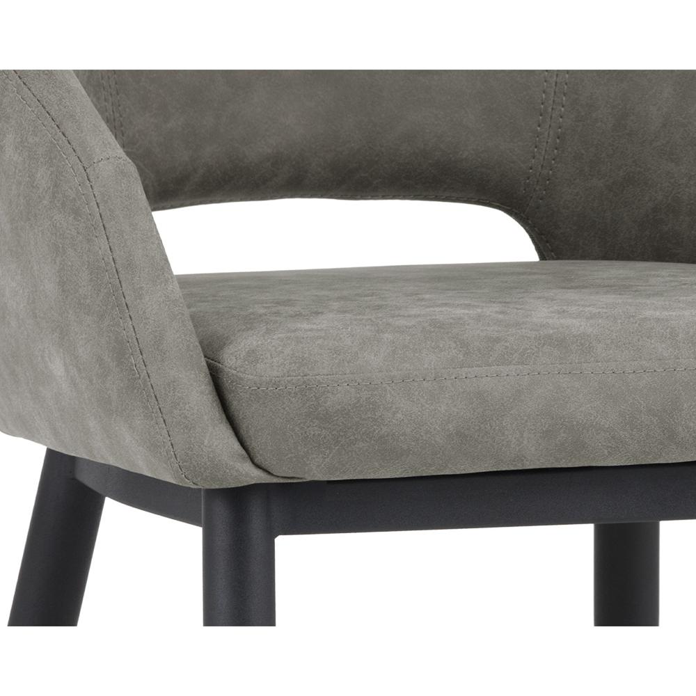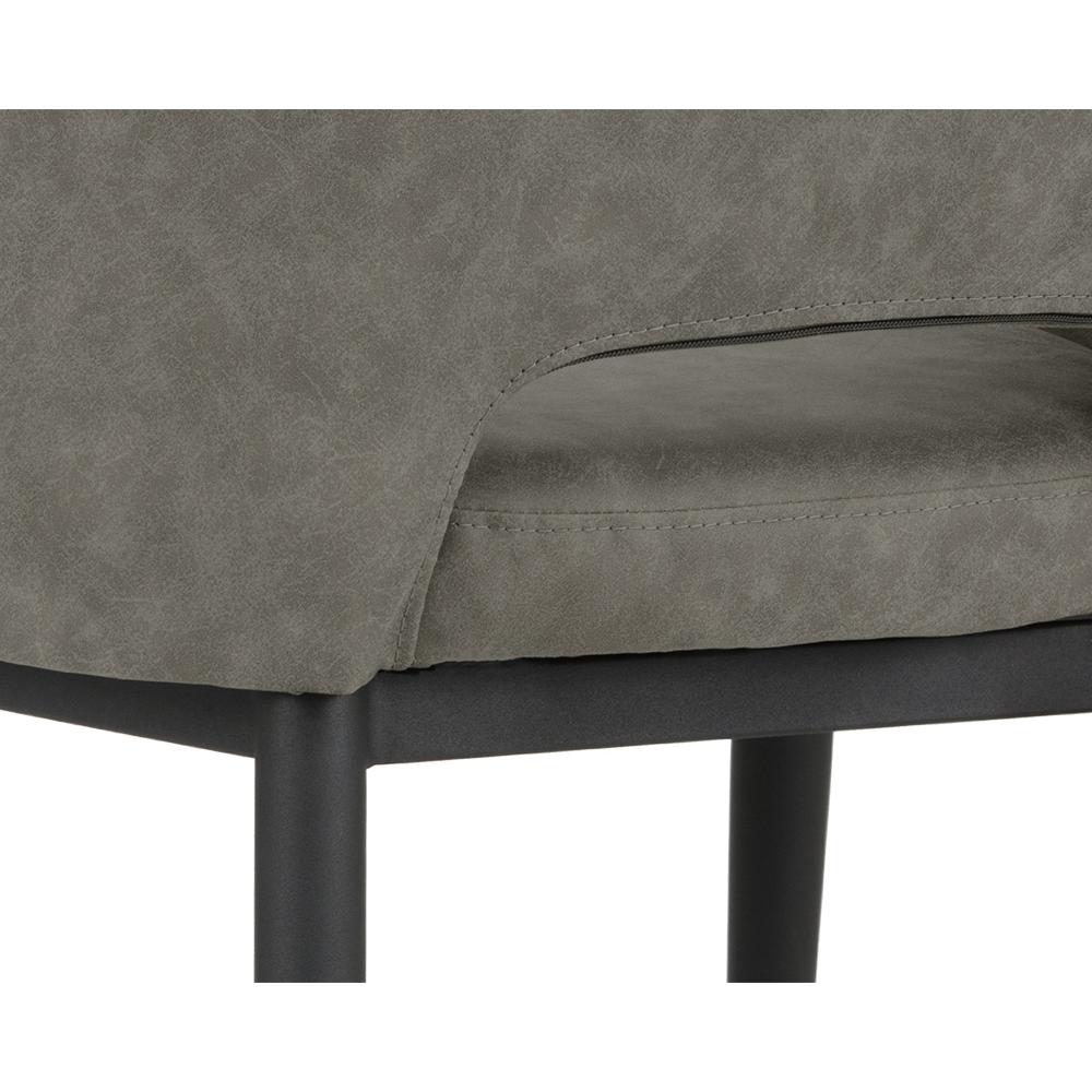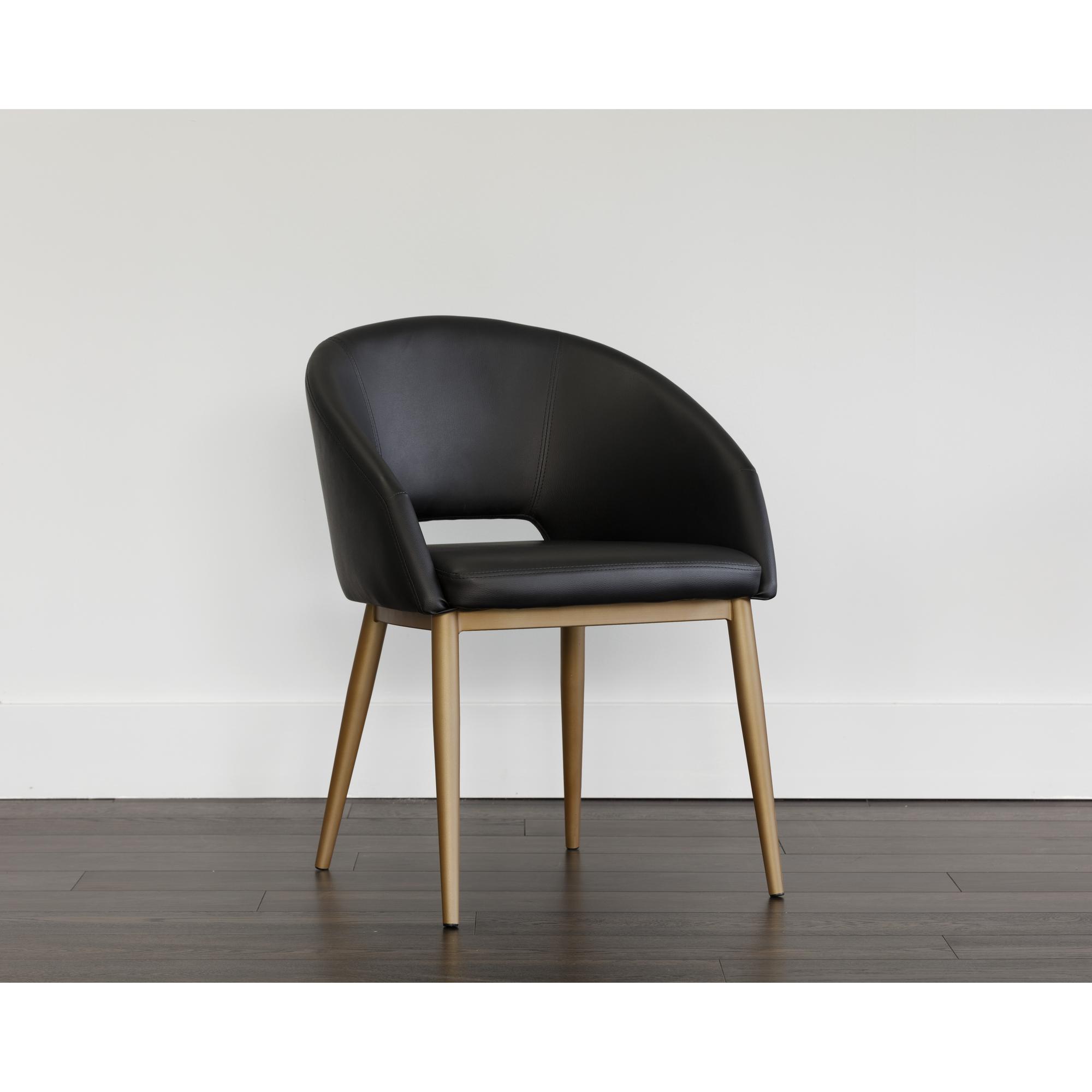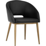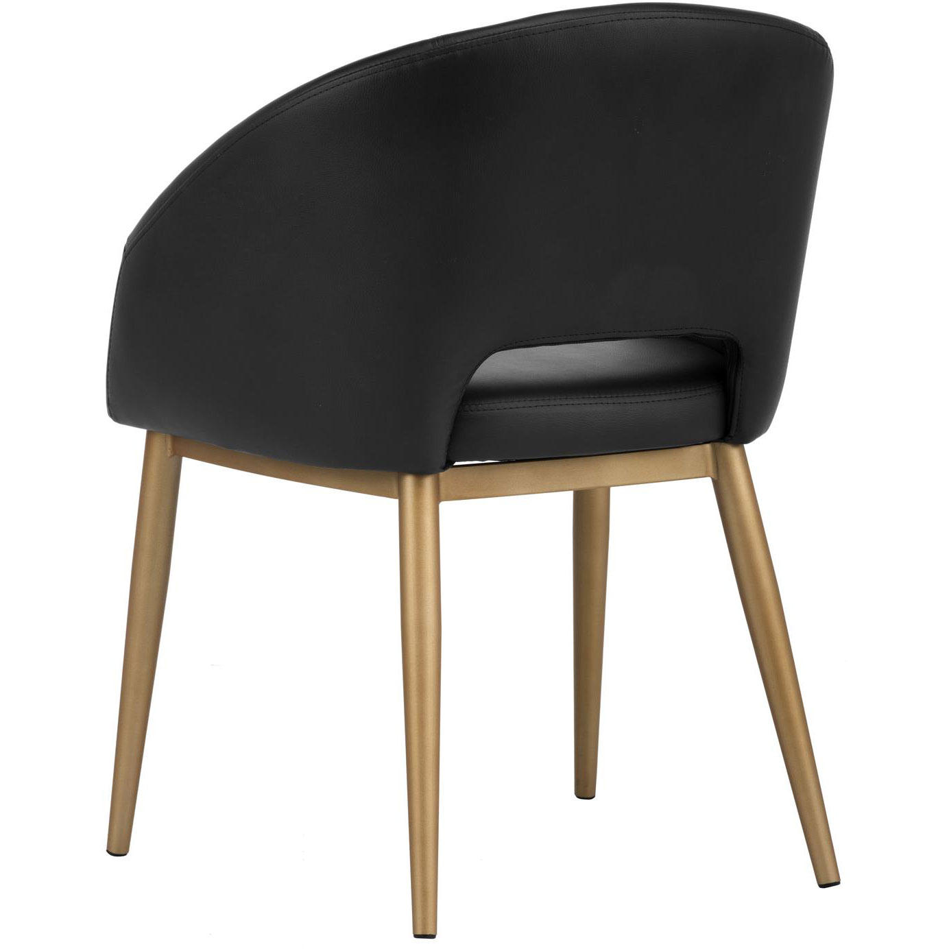 This compact barrel back dining armchair is effortlessly cool. Stocked in antique grey faux leather, blush sky or deep green sky fabric with a black powder coated steel frame, or onyx and snow faux leather with an champagne gold frame. Handle With Care: This design has been crafted with faux leather. Faux leather is manufactured to reflect the natural characteristics of leather; as such, colour variations, markings, wrinkles, grooves, and light scratches are appreciated characteristics. No two pieces will be alike.
