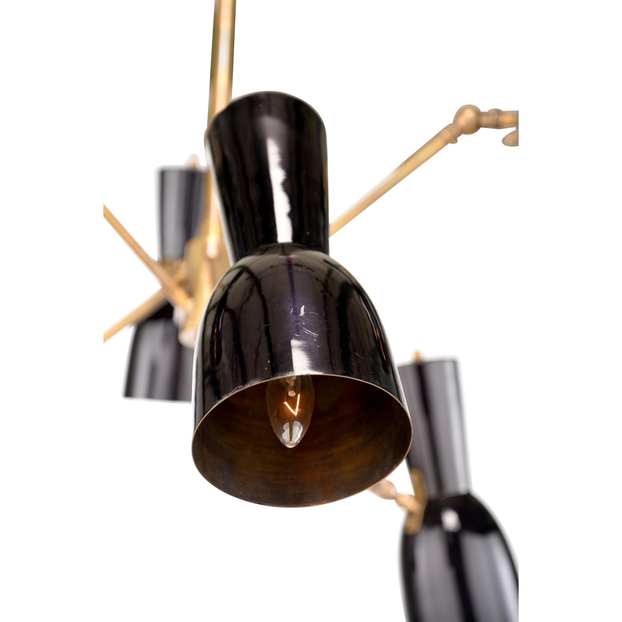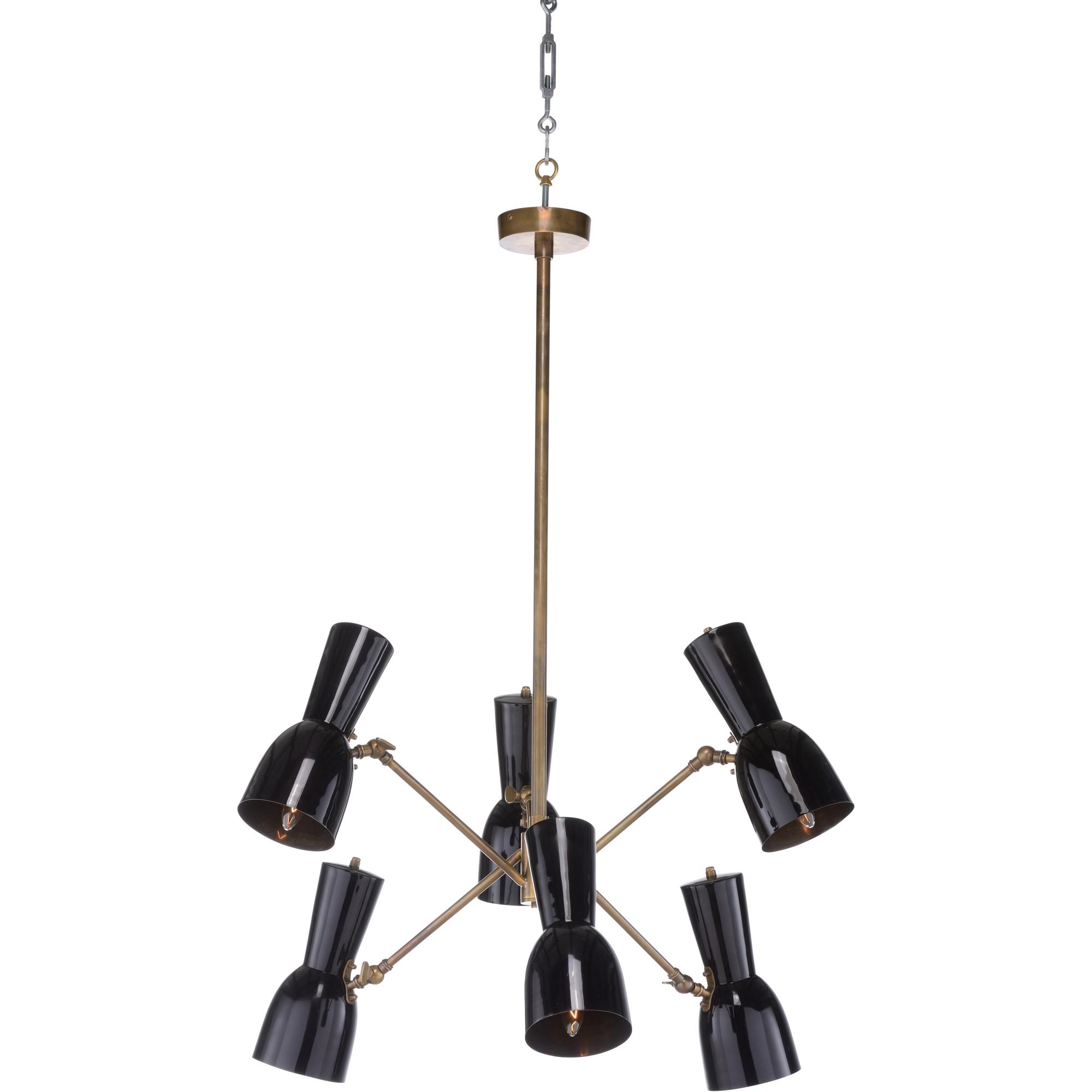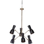 Thayer chandelier is a six arm chandelier inspired by the mid-century modern style. Each arm features a matte black cone shaped shade that tilts to provide directional illumination throughout your space.