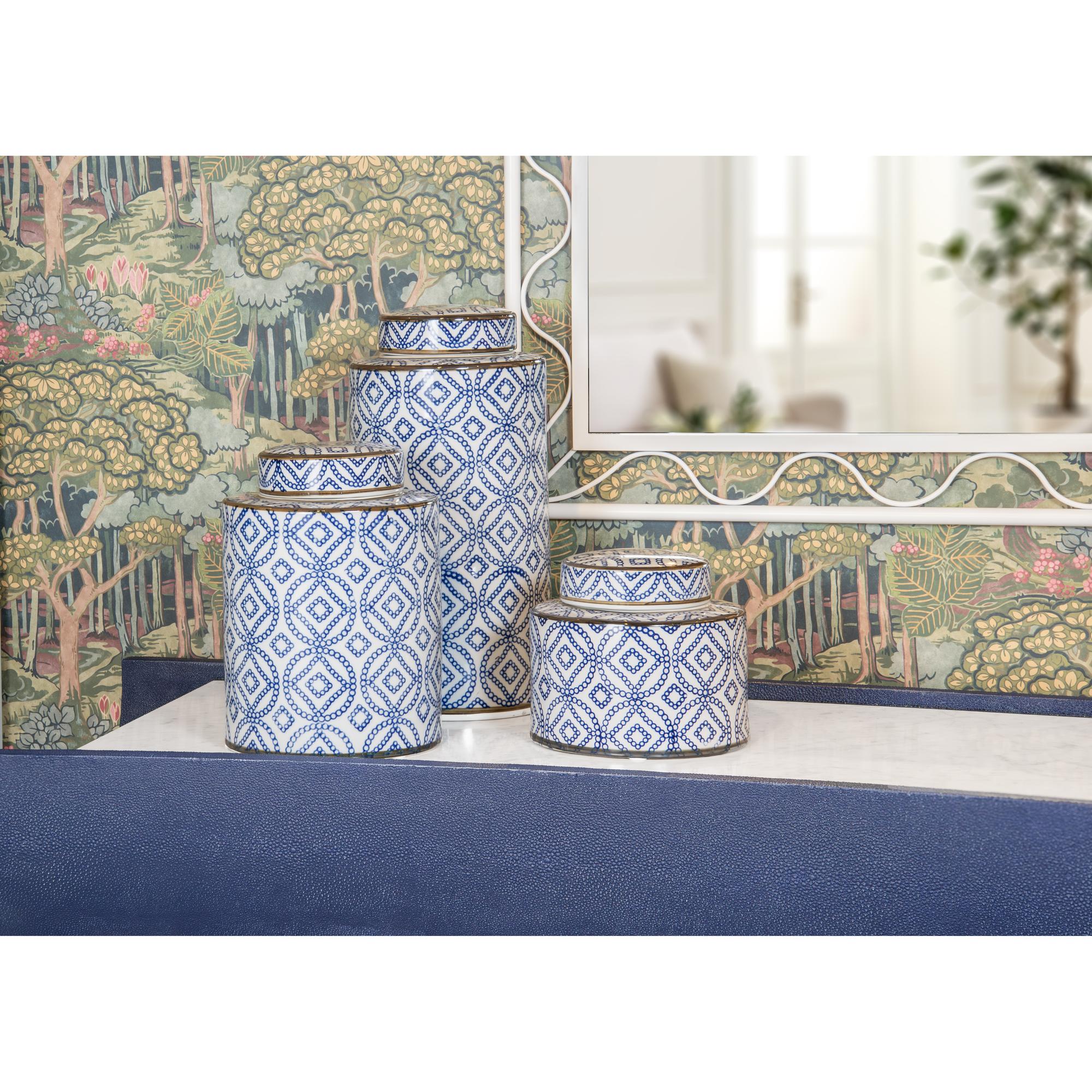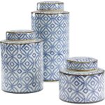 Thelma Canisters are a versatile, modern set of three blue and white glazed porcelain canisters with lids. They feature a geometric pattern of circles and diamonds which create an eye-catching design. The metallic gold trim adds a touch of panache. Use as a set to form a stunning centerpiece or individually throughout your home to convey a cohesive feel to your decorative style. Small 7″h x 7.75″w x 7.75″d Med 11″h x 7.75″w x 7.5″d Large 15.25″h x 7.75″w x 7.75″d
