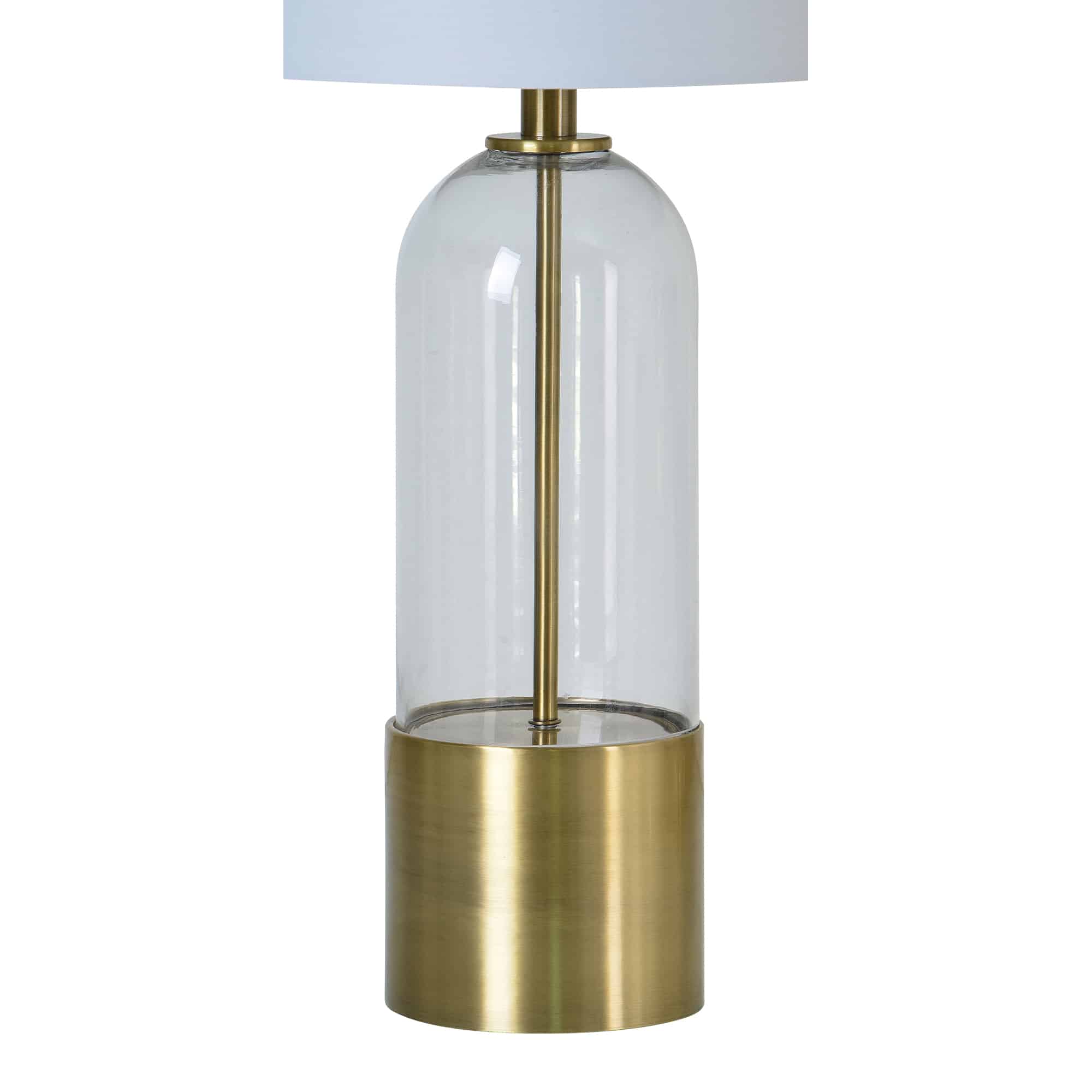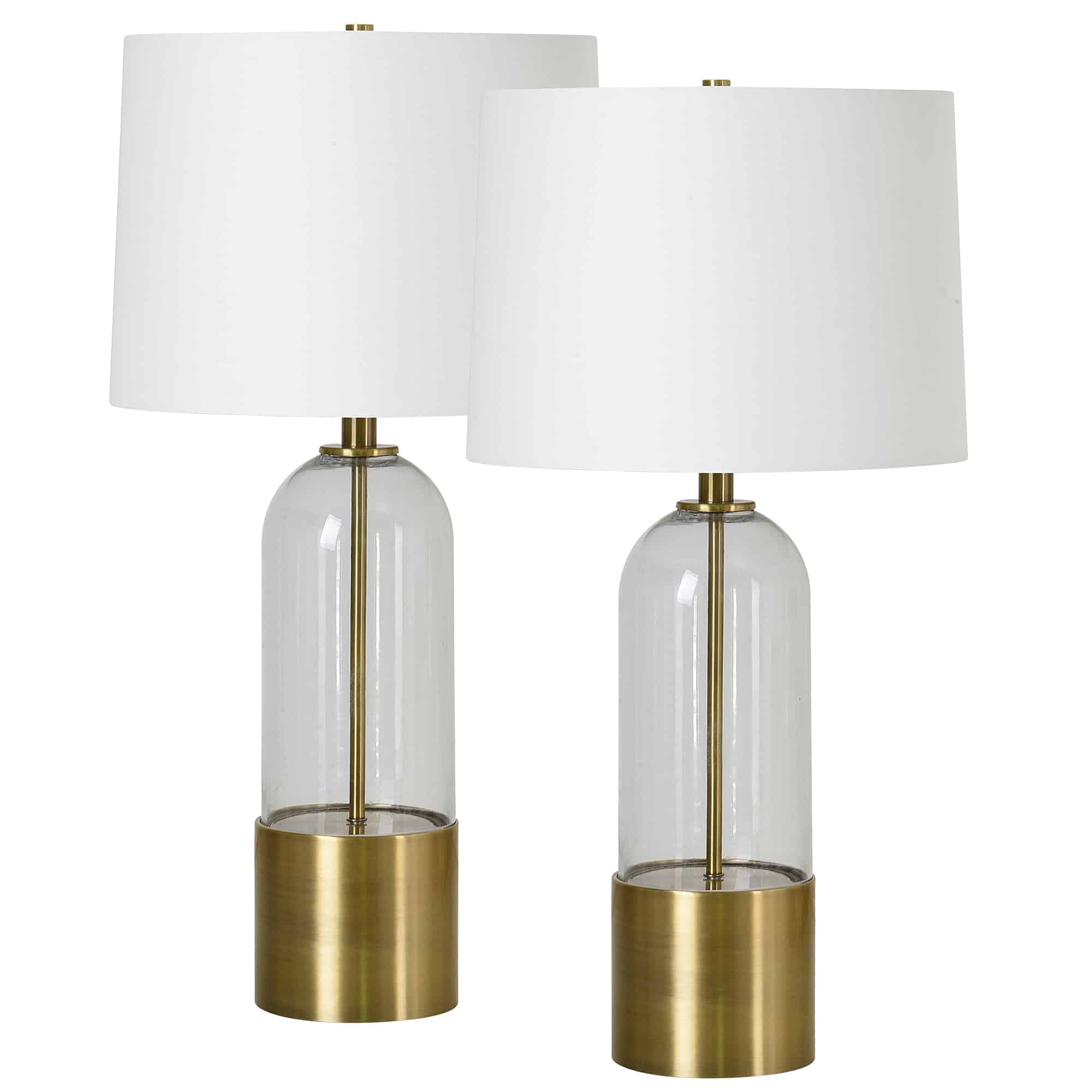 Mid-century modern design takes on a sleek ethereal quality in this set of table lamps. The elements of clear glass, antique brass plated iron and off-white shade form a trifecta of designer proportions. Surrounded by comforting yet elegant decor pieces, this pair elevates the space providing fashion and function.