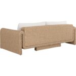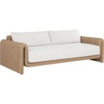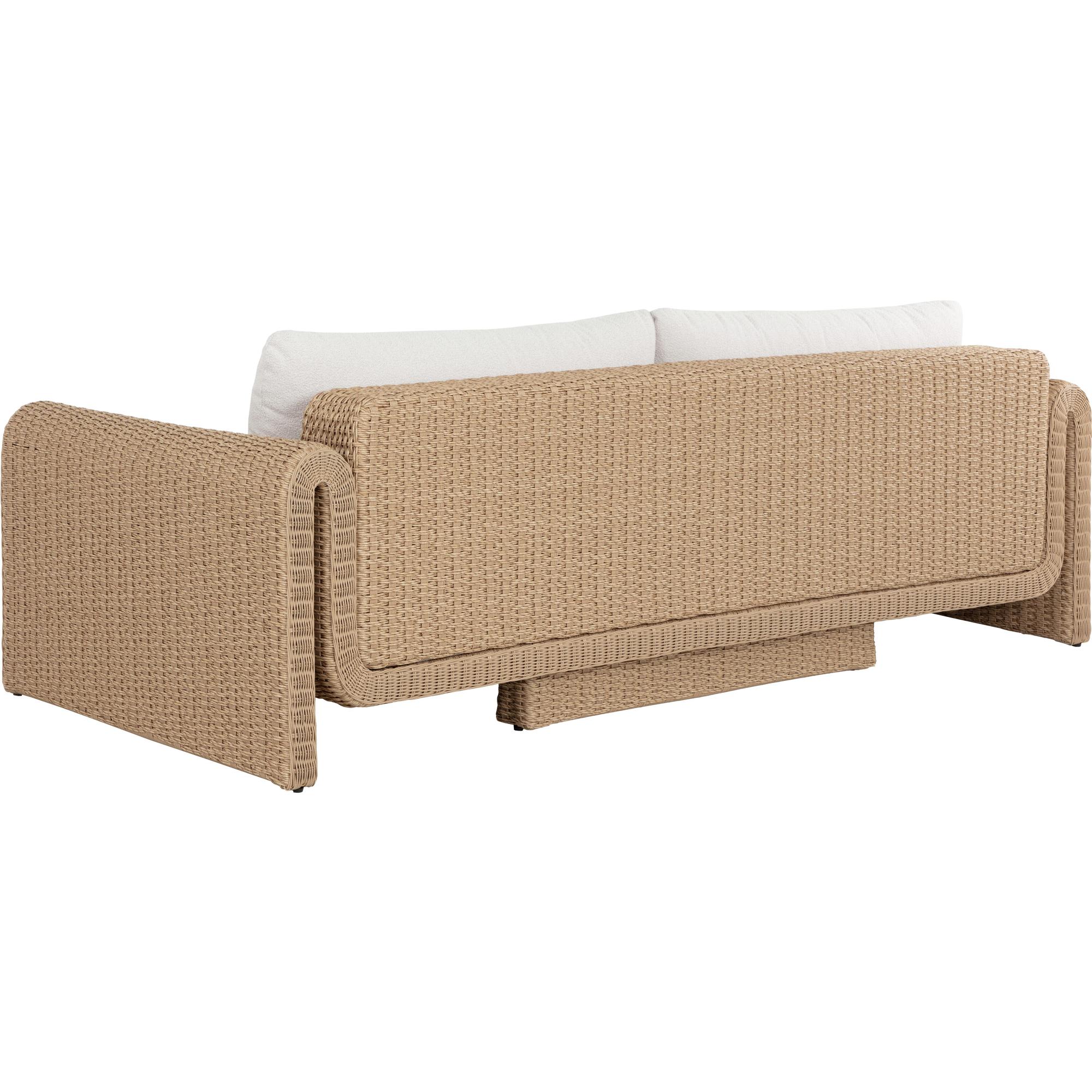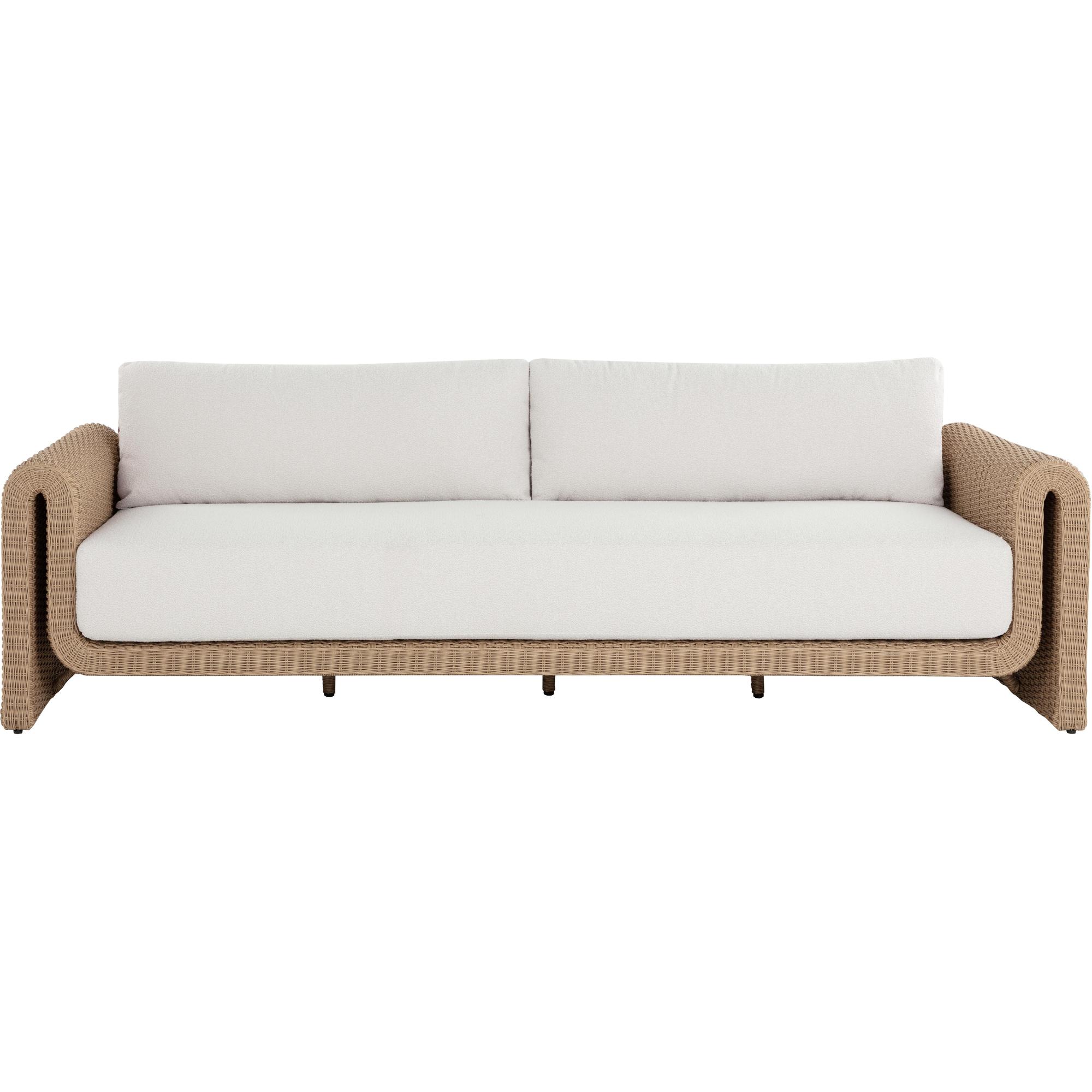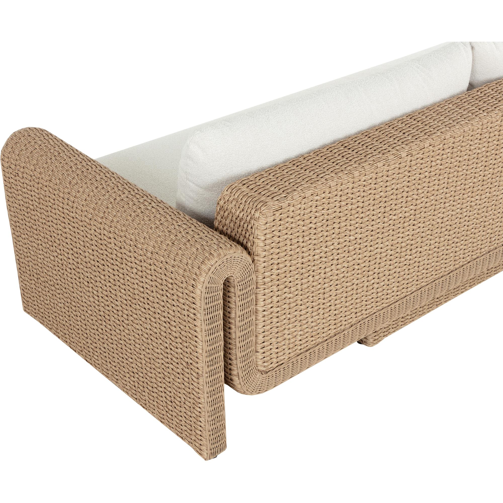 The curved proportions of the Tibi Sofa enhance the textural beauty of handwoven twisted wicker. The rolled arms connect seamlessly to nestle the comfortable cushioning upholstered in our louis cream outdoor boucle performance fabric.