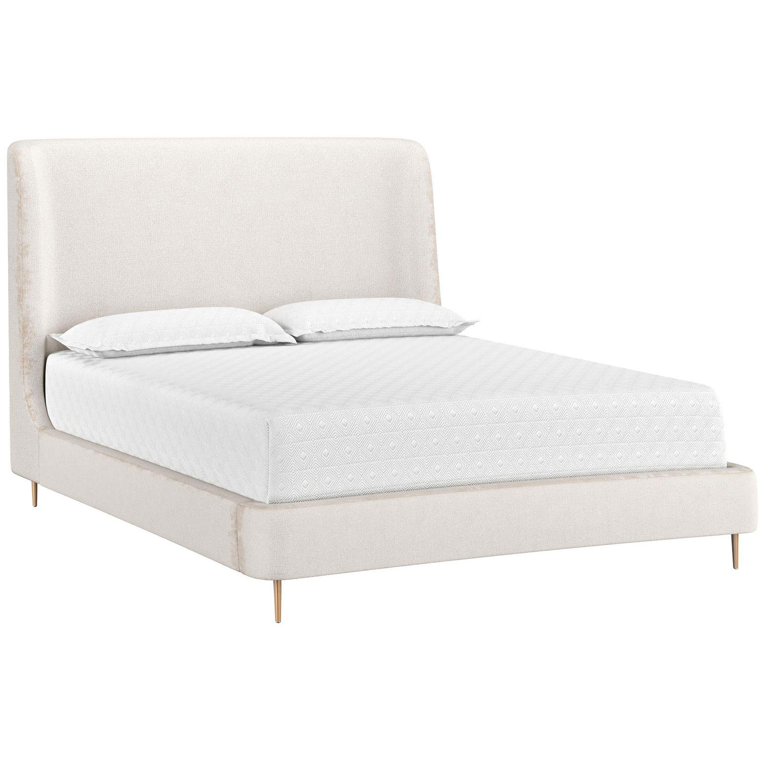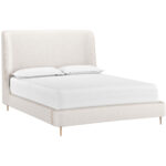 Boasting a stylish design with coastal influence, this beautiful bed exudes lavish comfort. A plush headboard with soft corners add an extra layer of coziness and fluidity. Upholstered in bergen taupe and french blue fabrics, and completed with minted copper steel legs. No box spring is required and slats are included. Coordinating chest, dresser and nightstand also available.
