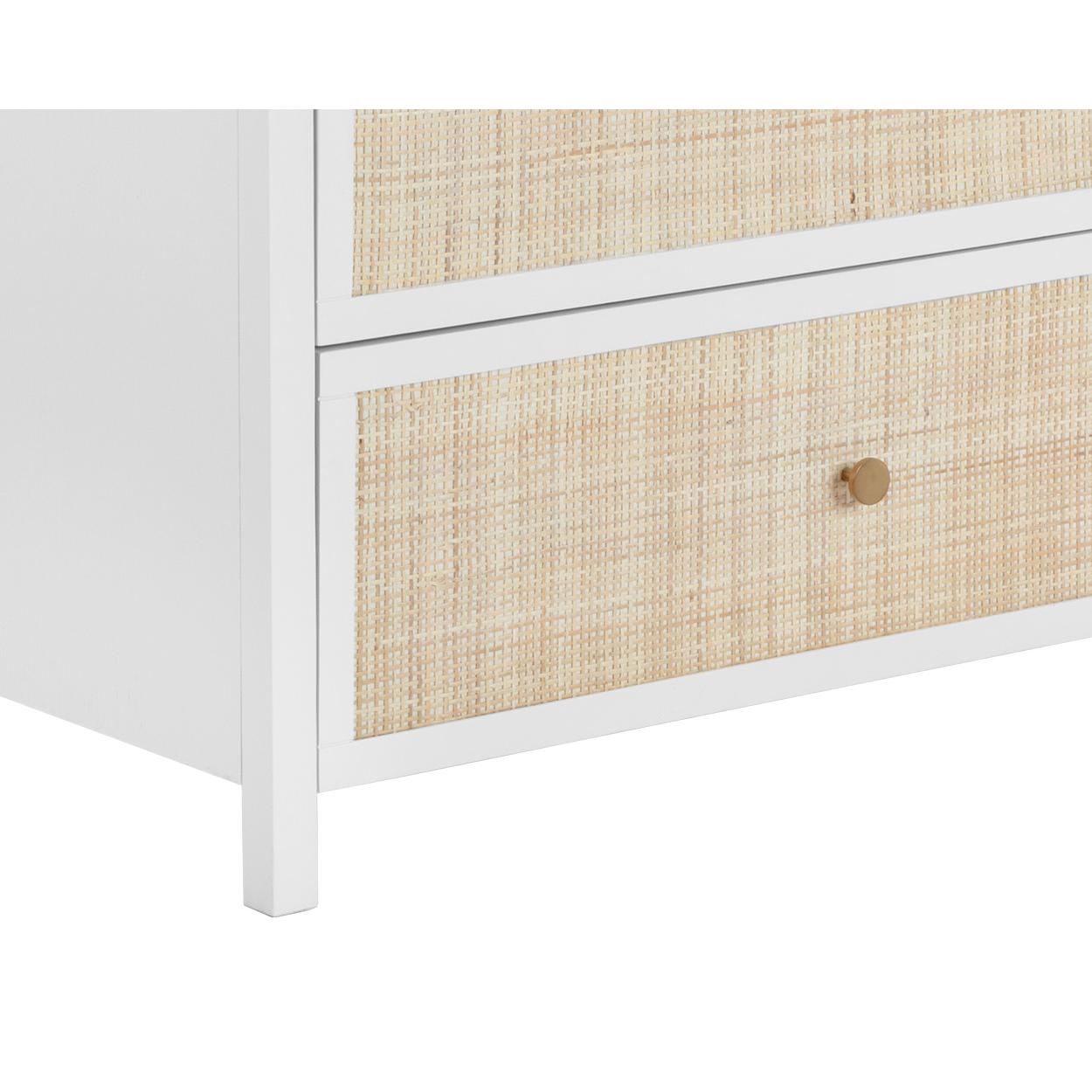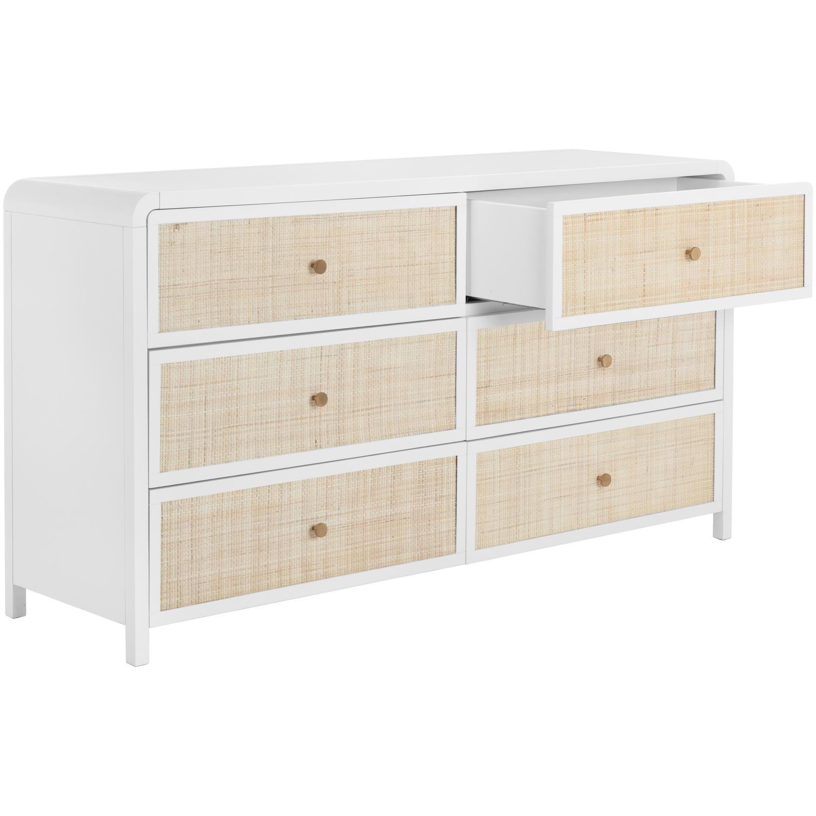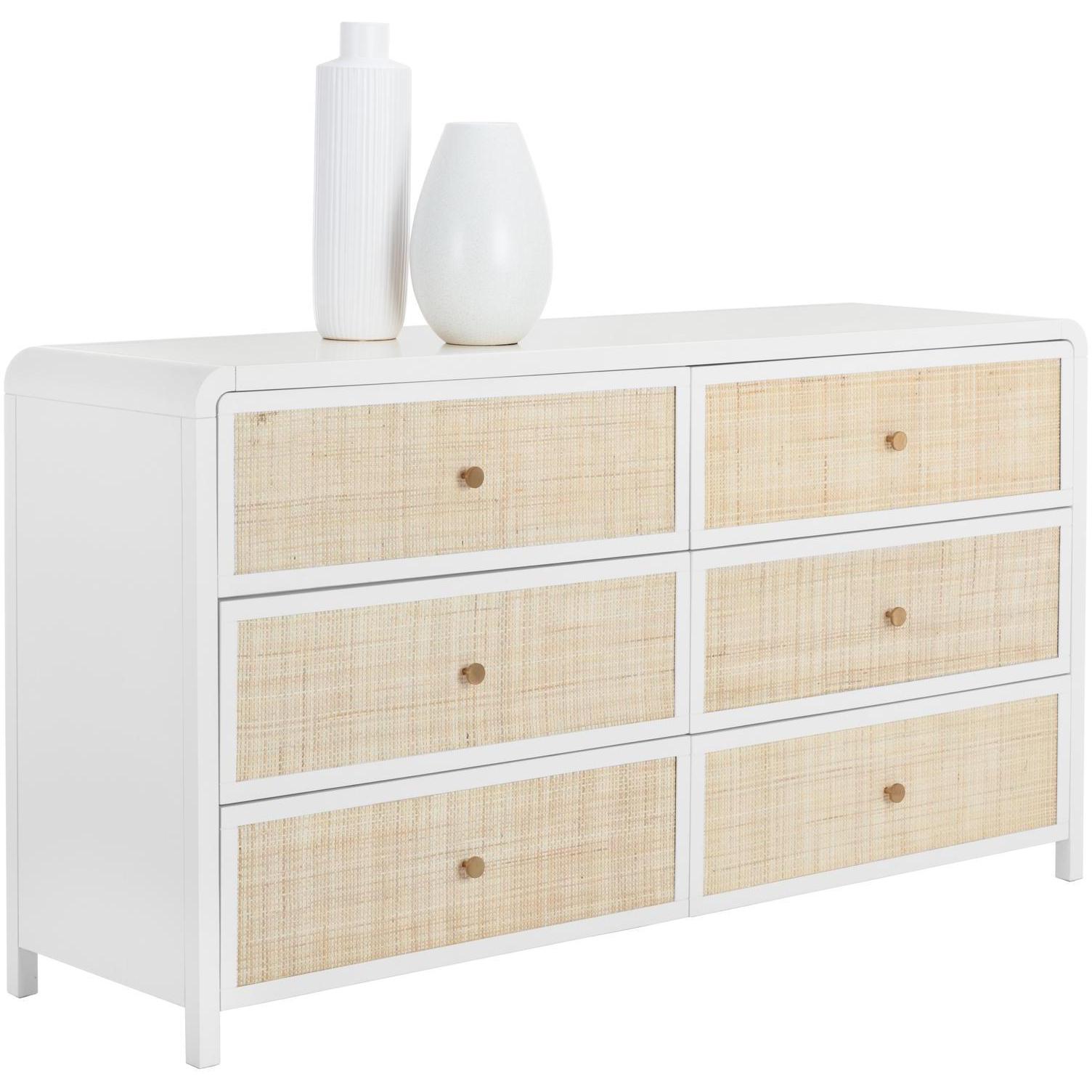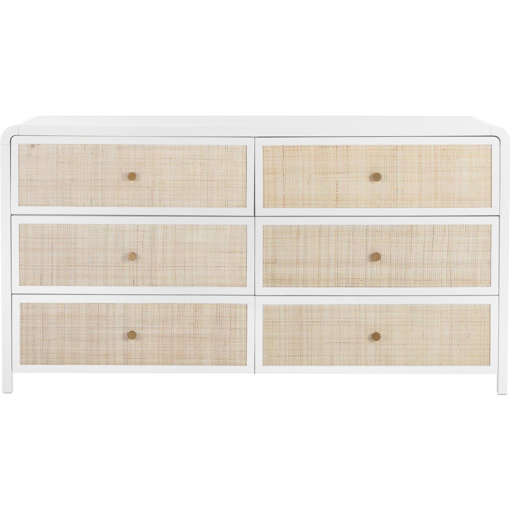 Boasting a stylish design with coastal influence, this beautiful dresser features a clean-cut silhouette. Features an antique white wood frame with natural rattan detailing on nine spacious drawers. Completed with minted copper steel hardware. Handle With Care: This design has been crafted with rattan. This artisan-crafted material features intricate weaving that results in natural variations where no two pieces are alike. Colour and texture differences are to be expected and embraced with this natural material. Due to the weaving process used, the fibres in this material may display shorter or longer lengths where the weaving ends. Visit our Product Care page for more information on how to ensure the lasting beauty of this piece. As wood is an organic, porous material, these pieces will contain natural variation of texture and may also exhibit fine indentations and cracks. Wood pieces will also display a disparity of colour and grain, and visible knots and burls that add to the character of each piece.