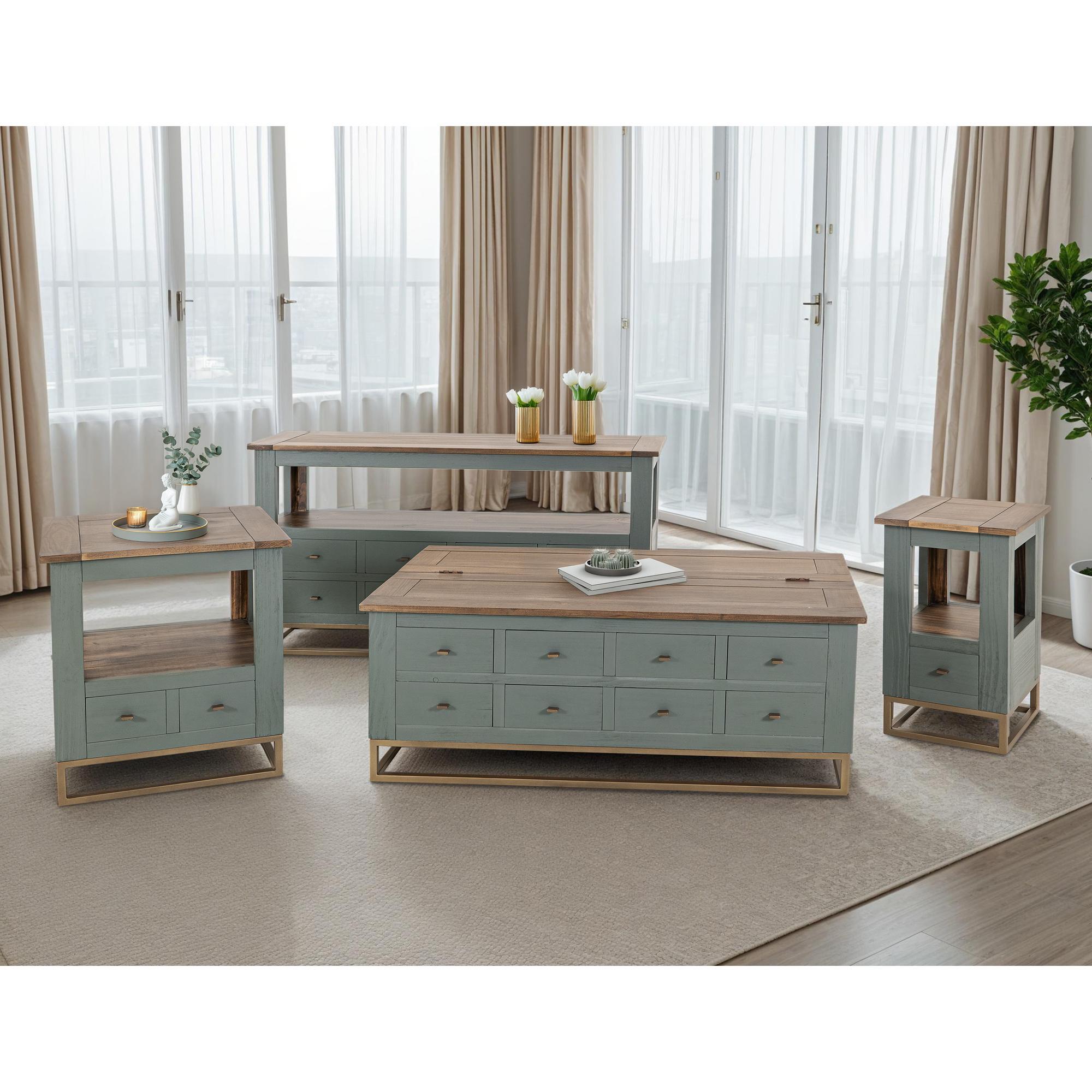 The Timber Occasional Tables are remarkable furniture pieces that beautifully combine functionality and style. Designed to enhance your living room, these tables are crafted from high-quality pine and poplar wood and showcase a rich, multi-step lacquer in an eye-catching green finish. They are accented by a hand-rubbed brown top that enhances the wood’s natural beauty. The cocktail coffee table offers deep storage beneath a hinged top and boasts eight drawers that glide smoothly on wood-on-wood slides, offering ample space for your essentials. Supported by a sleek gold metal base, the Timber Occasional Tables are an elegant and functional addition to any space.
