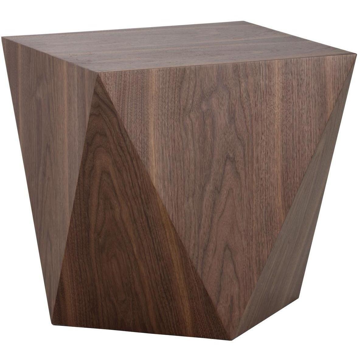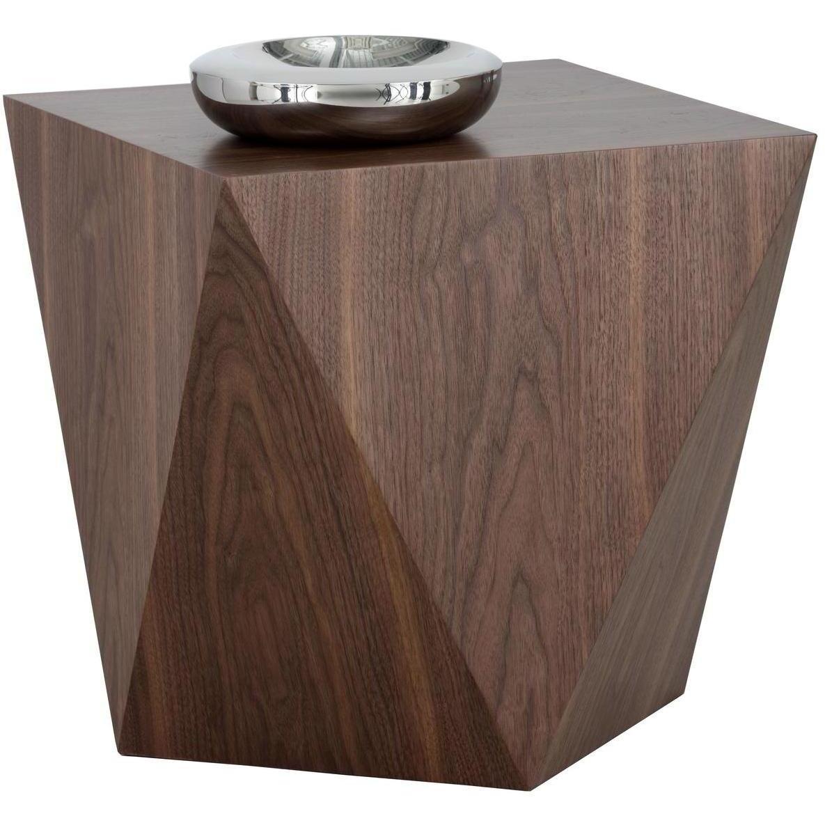 A mid-century modern influenced end table from. Designed with a sleek geometric shape and finished with a rich warm-toned walnut veneer. A captivating piece.