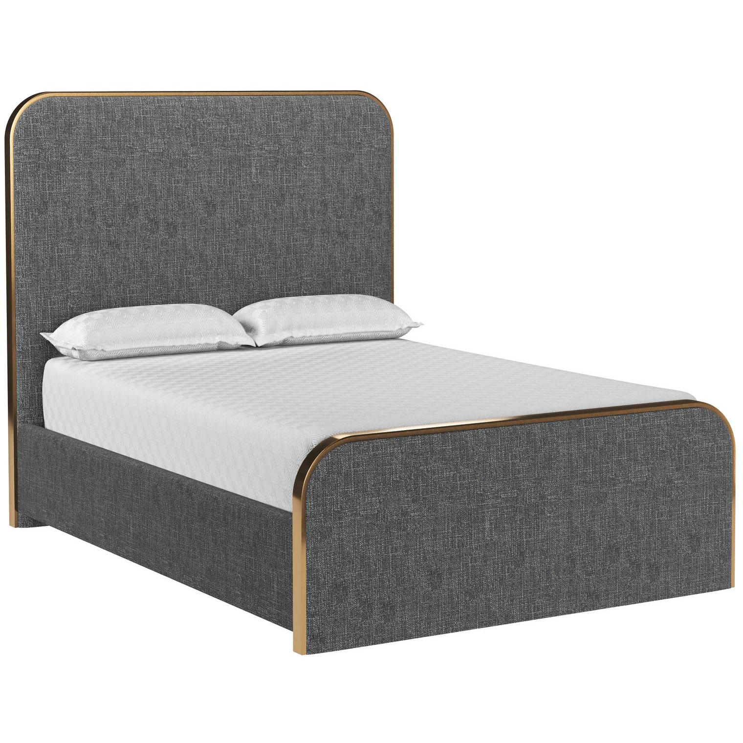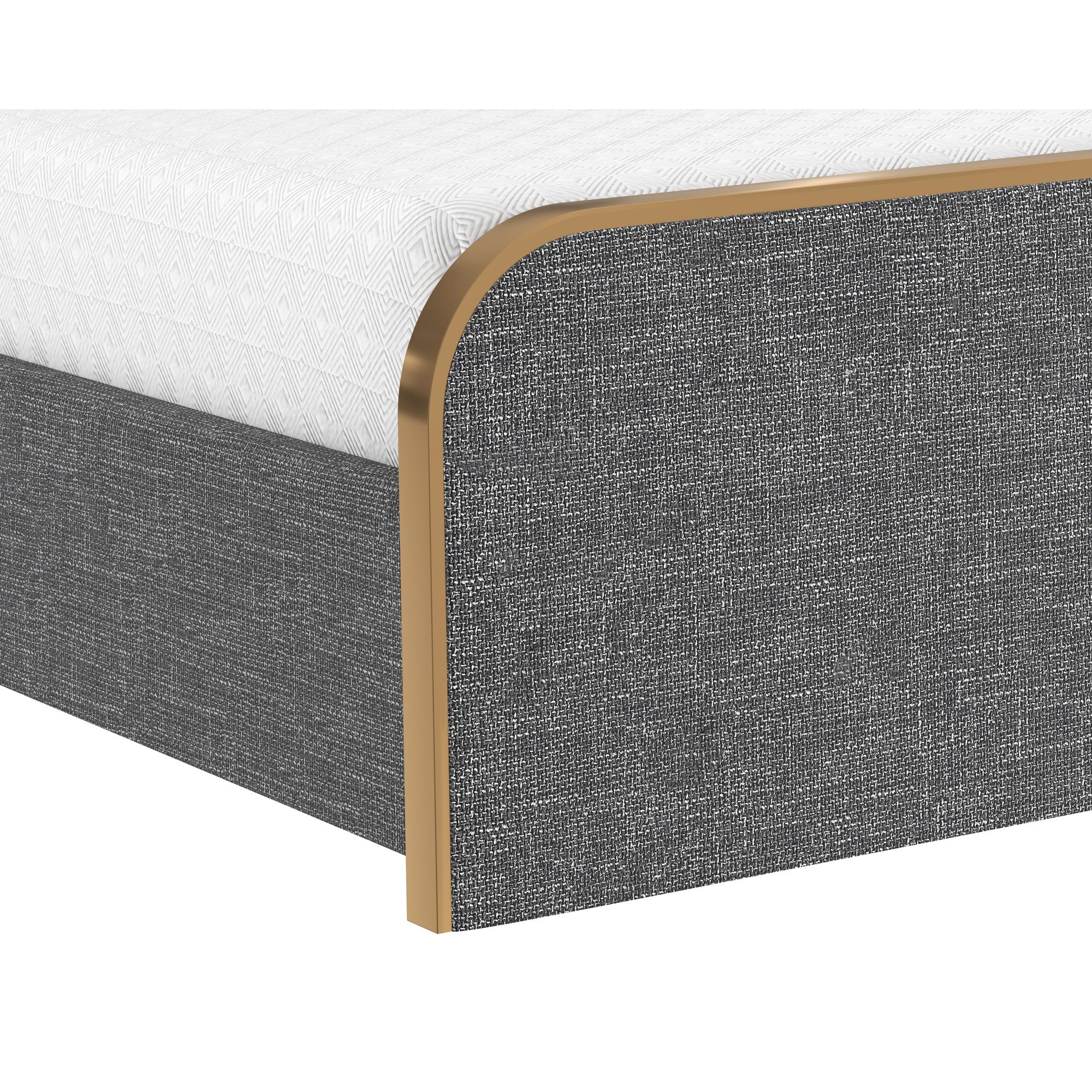 Effortlessly sleek and modern, this bed is a brilliant addition to any bedroom space. Features a gently curved headboard and footboard upholstered in chacha grey fabric with a stainless steel border in a brushed gold finish. No box spring is required and slats are included.