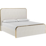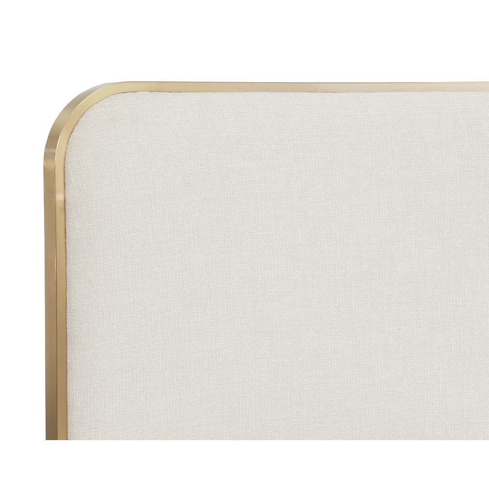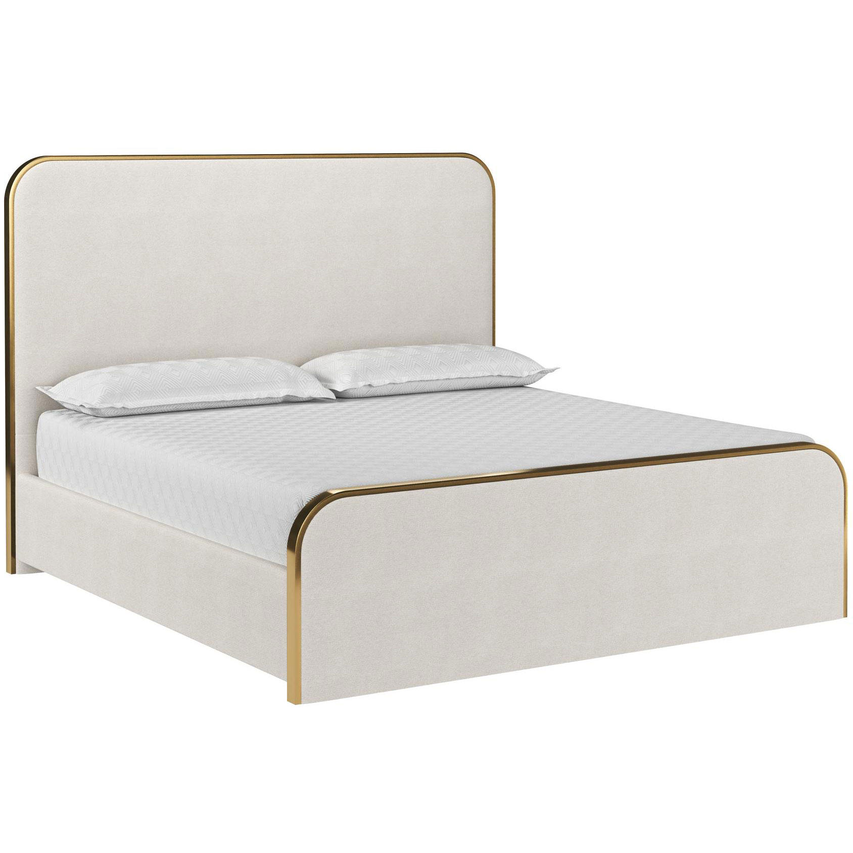 Effortlessly sleek and modern, this bed is a brilliant addition to any bedroom space. Features a gently curved headboard and footboard upholstered in chacha cream fabric with a stainless steel border in a brushed gold finish. No box spring is required and slats are included.