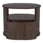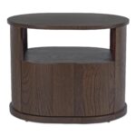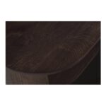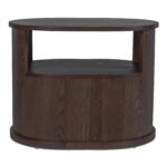 The Tommy nightstand embraces modern simplicity in rich dark brown. Its distinctive racetrack capsule shape adds a contemporary touch to the bedroom, seamlessly blending form and function. This nightstand features a solid oak frame with oak veneer details, offering durability and refined style. The soft-close drawer and open shelf provide versatile storage options in a piece that speaks to modern appeal.