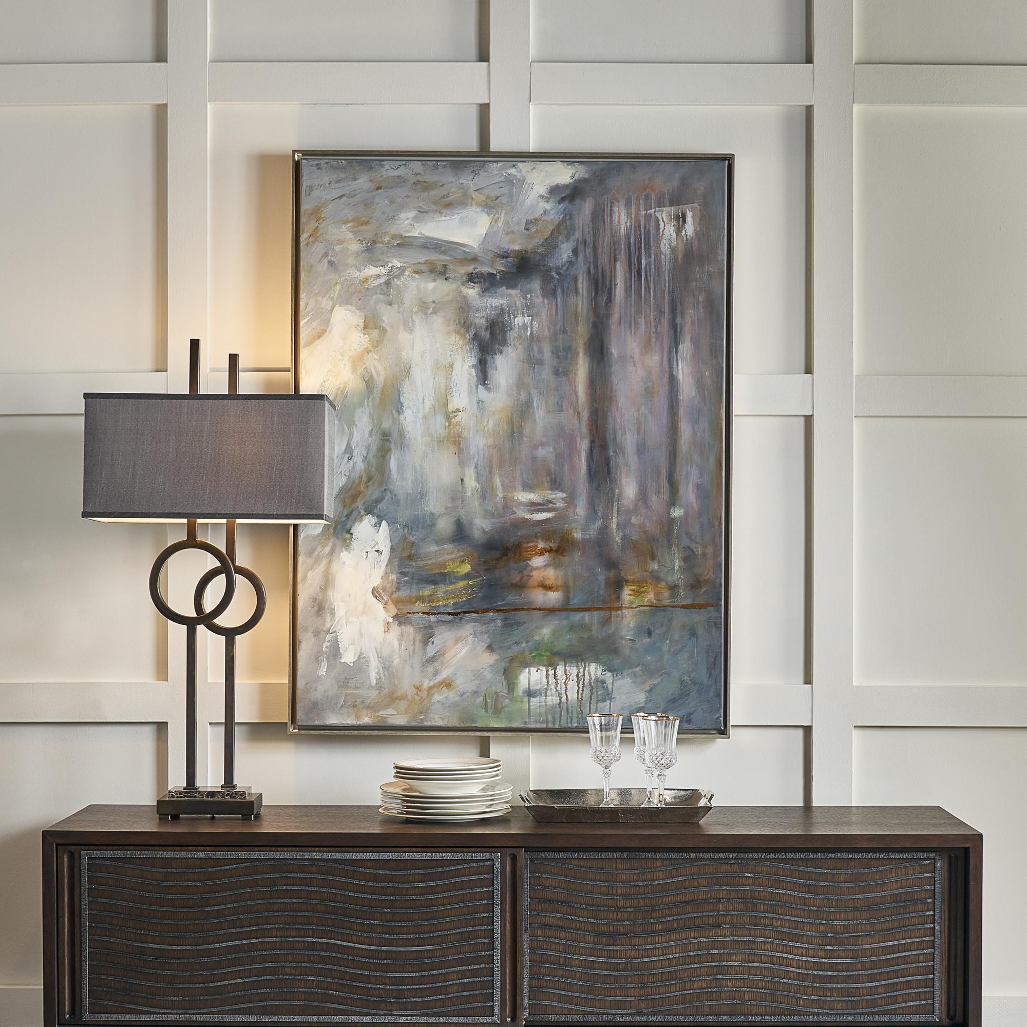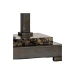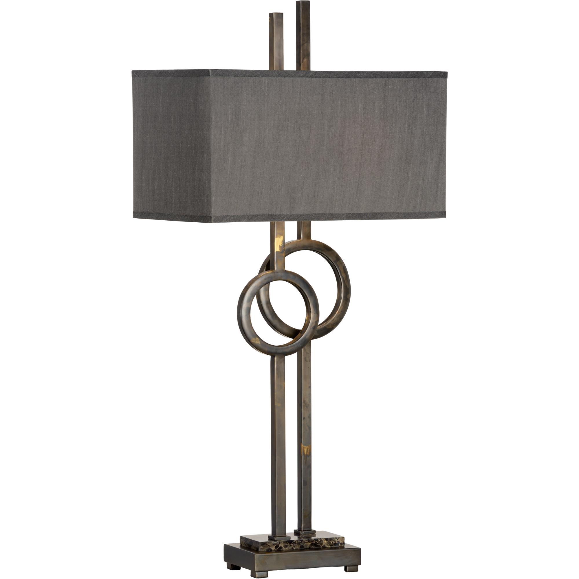 Scorched bronze finish on double iron circles with a natural brown marble base make a unique lamp for a bedside table or living room console in a masculine space. A rectangular charcoal gray silkette shade covers two lights and completes this rustic modern design.
