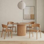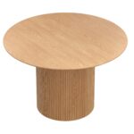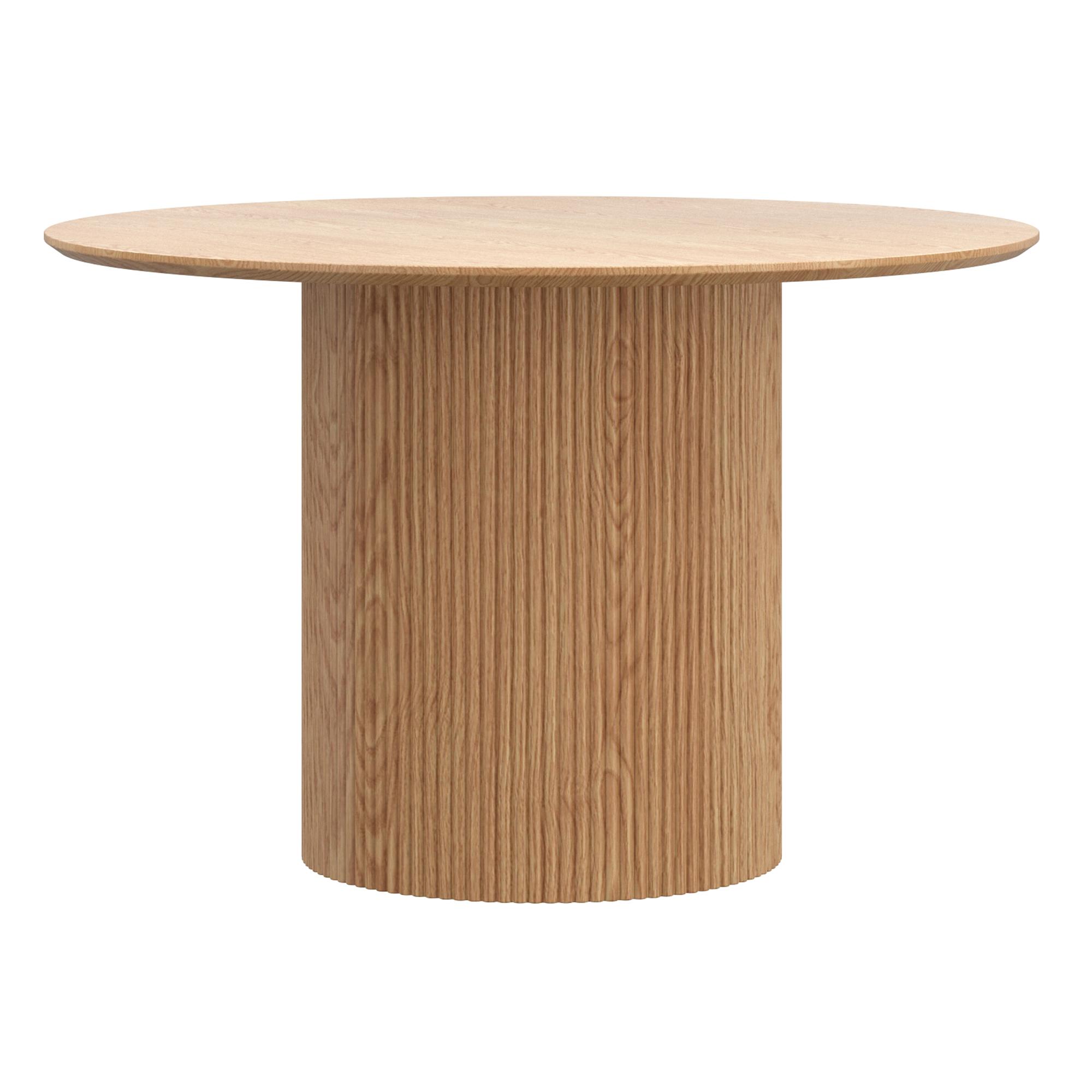 Elevate your dining experience with this round pedestal base dining table, a hallmark of high-end designer inspiration. Featuring a beautifully reeded wood base, this table exudes timeless charm, offering a refined focal point for any dining space. The bevelled table top and the visible wood grain throughout add natural beauty and organic texture. Sturdy solid oak and plywood construction chairs comes fully assembled and ready to use. Mid-century modern styling with oak veneer finish is an easy match for various décor styles. Comfortable curved back creates a trendy look and provides support. Stackable design makes it easy to store away extra pieces when not in use.