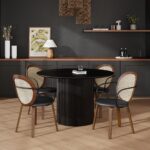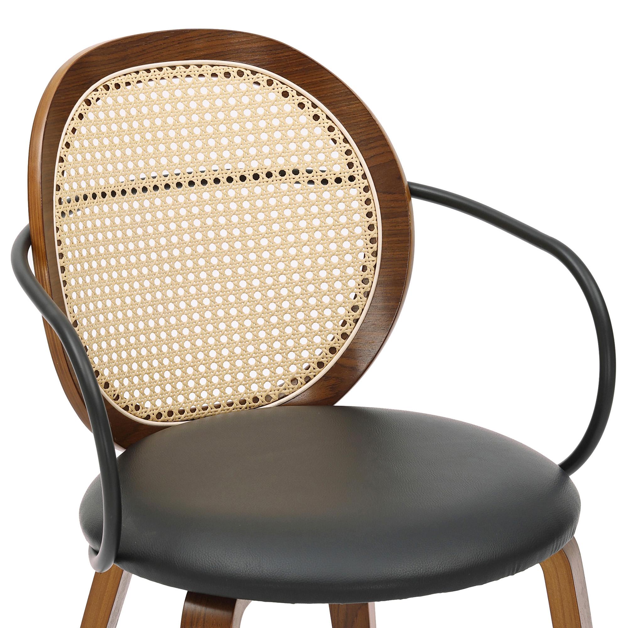 Elevate your dining experience with this round pedestal base dining table, a hallmark of high-end designer inspiration. Featuring a beautifully reeded wood base, this table exudes timeless charm, offering a refined focal point for any dining space. The bevelled table top and the visible wood grain throughout add natural beauty and organic texture. The faux rattan on the chair back creates a soft and inviting look while the black metal wrap-around arms and black faux leather seat give a more updated look to these chairs. The walnut finish of the bentwood frame and legs is the perfect finishing touch to tie it all together. Great for formal or casual dining spaces.