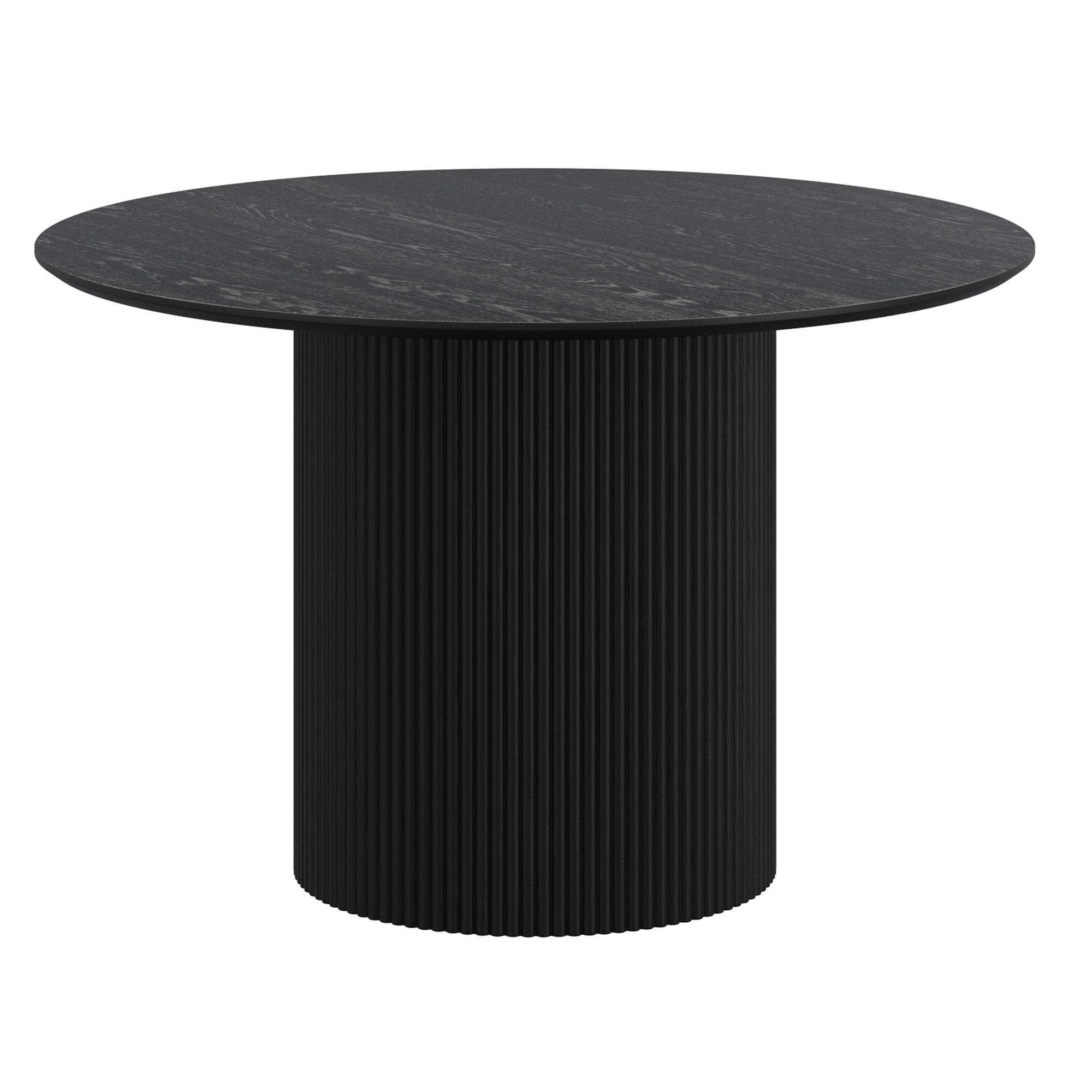 - Wide pedestal, engineered wood base with reeded detail and laminated veneer