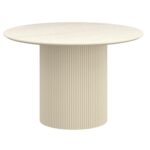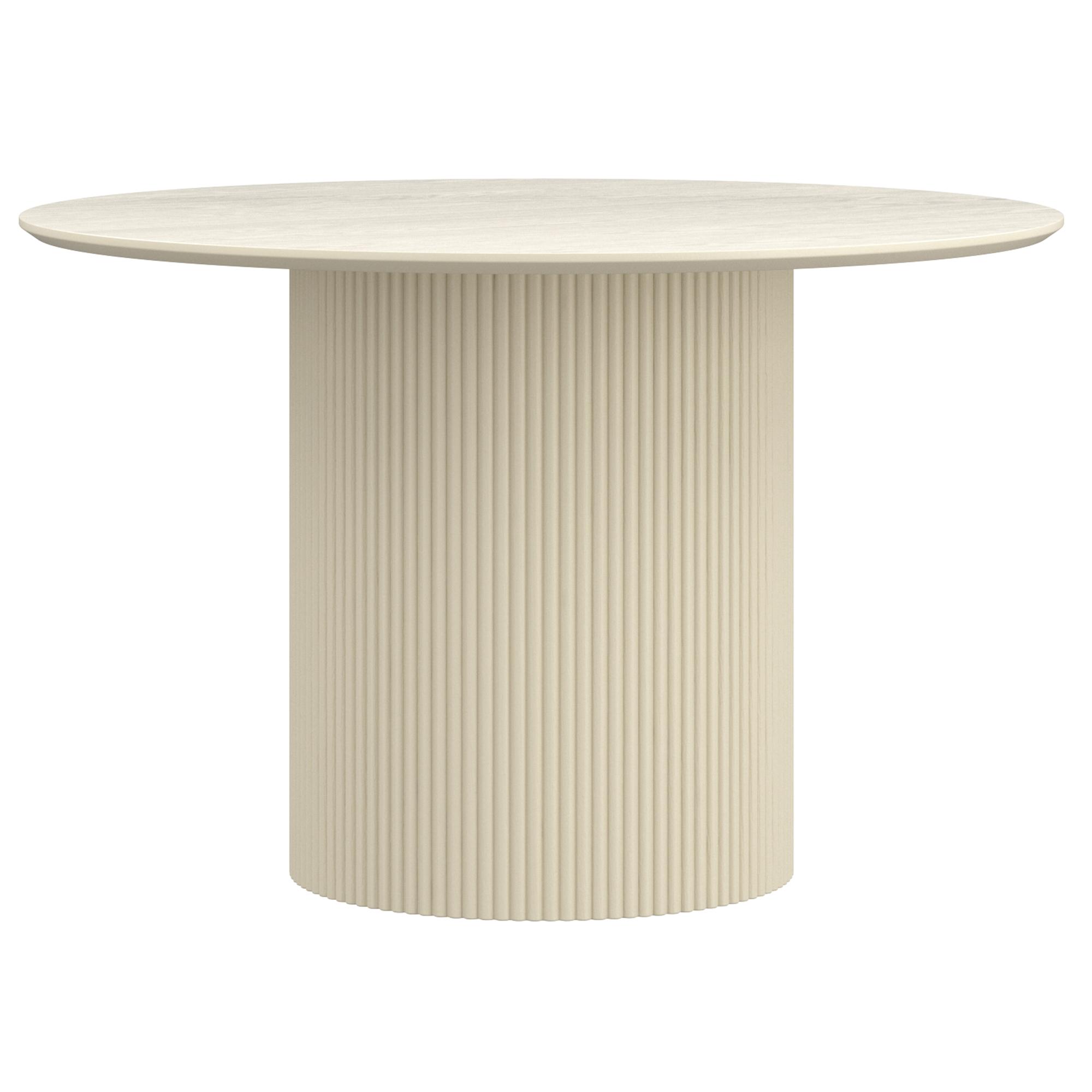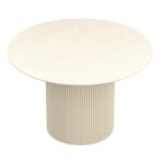 Elevate your dining experience with this round pedestal base dining table, a hallmark of high-end designer inspiration. Featuring a beautifully reeded wood base, this table exudes timeless charm, offering a refined focal point for any dining space. The bevelled table top and the visible wood grain throughout add natural beauty and organic texture.