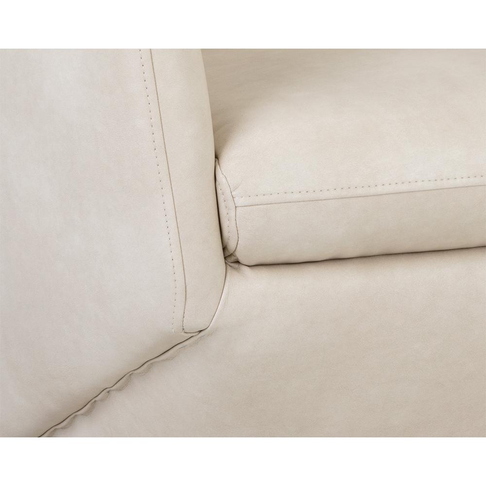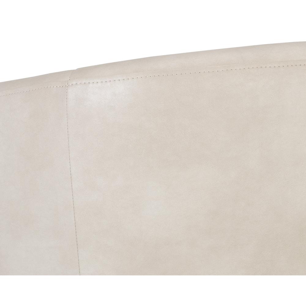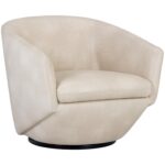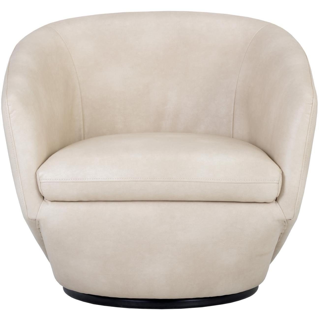 A modern swivel lounge chair designed with an angular base and a comfortable seat. Available in bravo cream faux leather with a black steel base. Handle With Care: This design has been crafted with faux leather. Faux leather is manufactured to reflect the natural characteristics of leather; as such, colour variations, markings, wrinkles, grooves, and light scratches are appreciated characteristics. No two pieces will be alike.