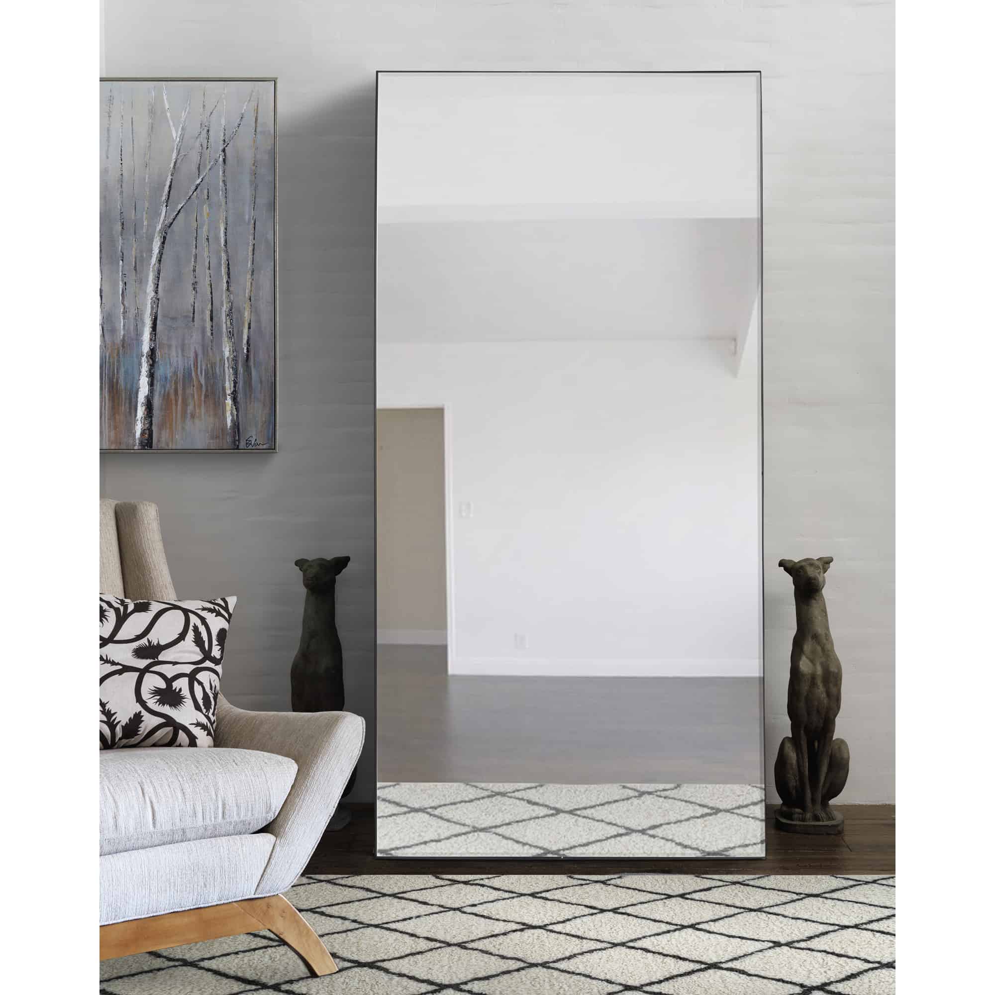 The understated design of this full-length wall mirror exudes classic cool. The thin profile of the iron frame features a black finish that fits beautifully on feature walls in formal and casual rooms. The streamlined style of the rectangular mirror is an instant standout among modern fixtures and furnishings.