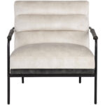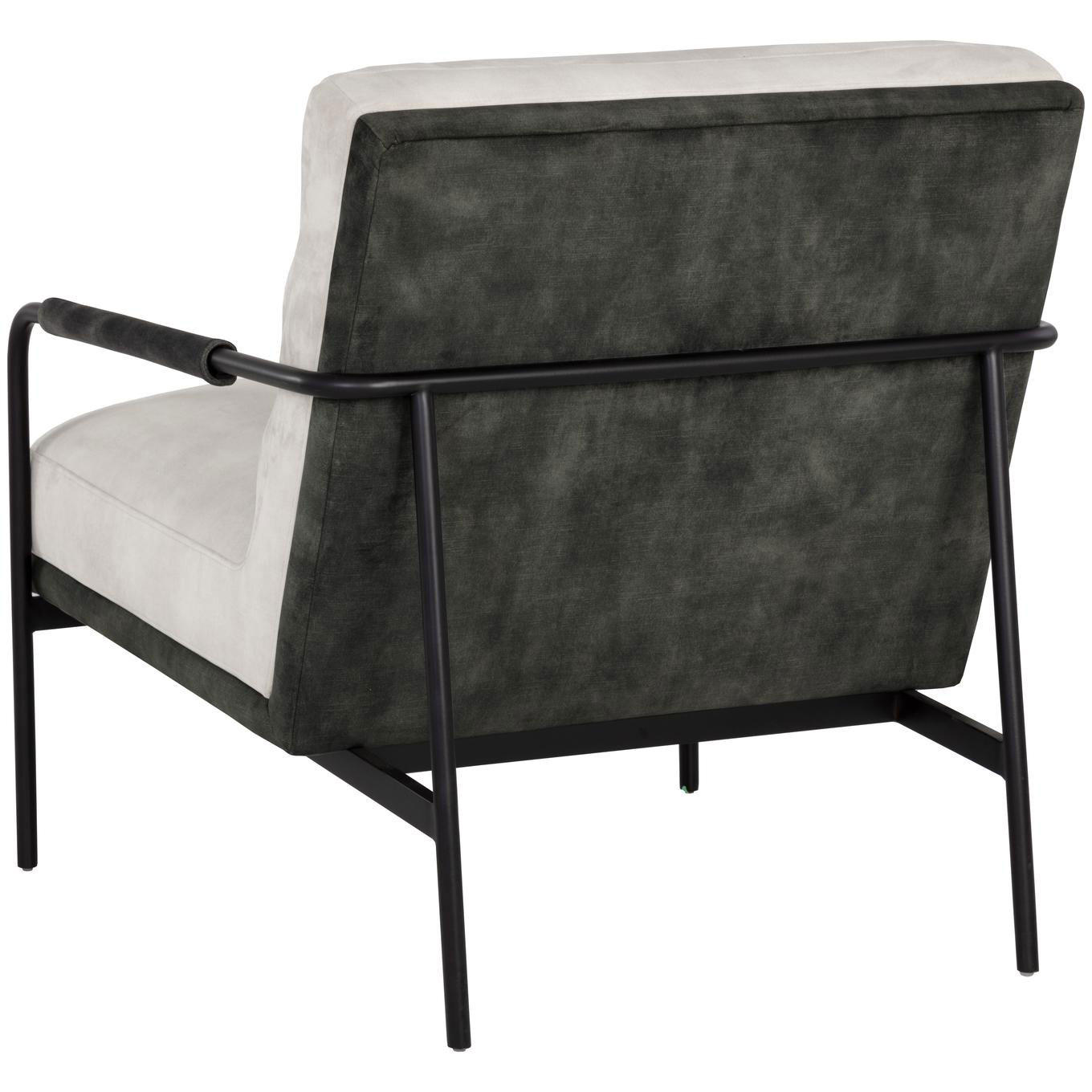 The perfect statement lounge chair chair that will add a mid-century modern vibe to any space. Stocked in nono cream fabric on the interior and an accenting nono dark green fabric on the exterior. Includes acacia wood armrests and completed with a black metal frame. Also available in nono petrol fabric.