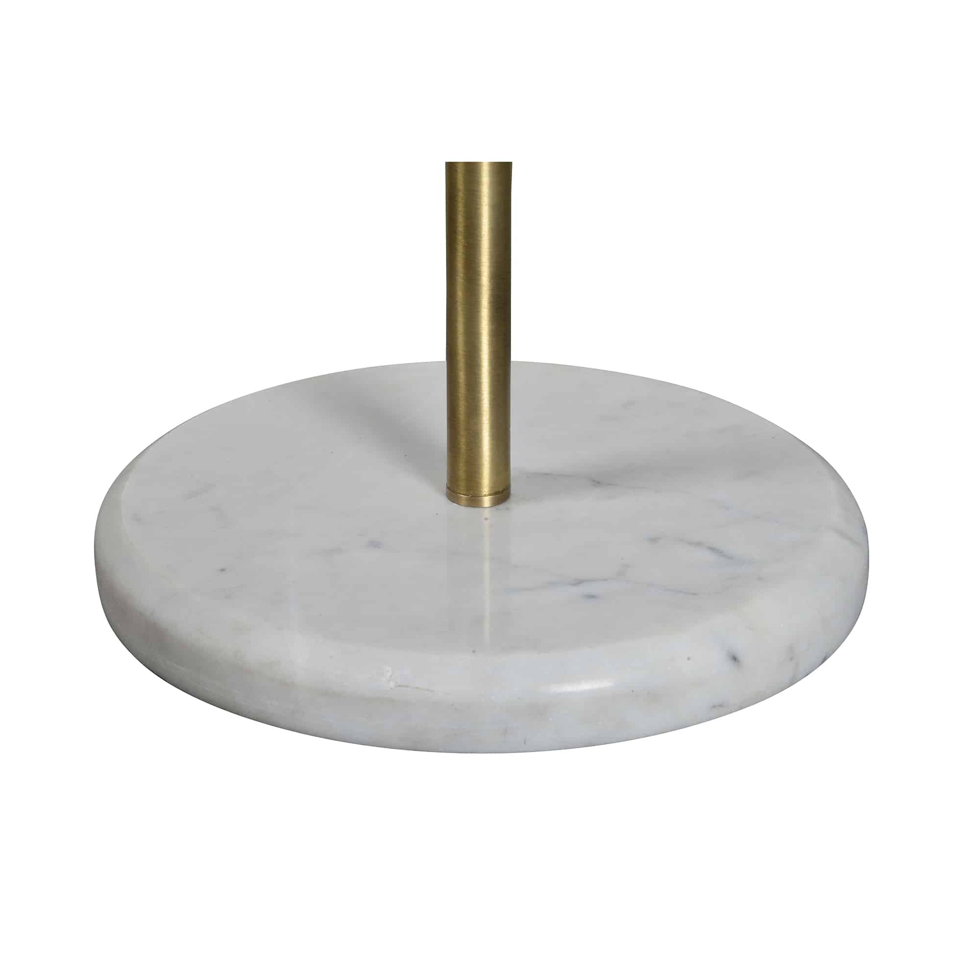 The artful proportions of this decorative floor lamp play with the contrast of angles and curves. The slanted silhouette of the matte white metal shade is delicately balanced by a metal stem and round white marble base. Finished in polished brass for a hint of modern glamour, the jointed metal stem can pivot the lampshade toward areas that require additional illumination.