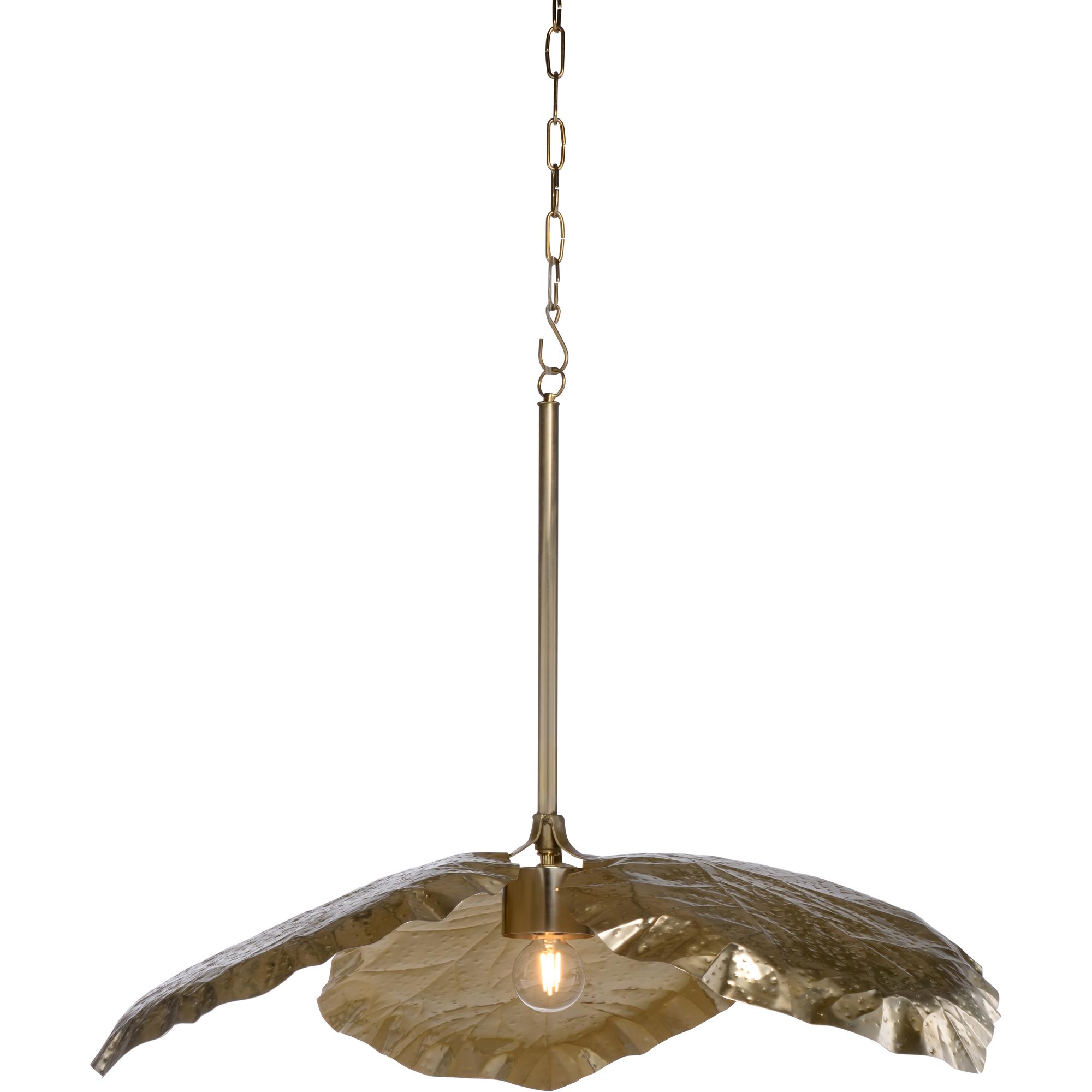 Create a tropical oasis in your coastal home design with our Tropical Leaf Pendant. Crafted in steel with a warm antique brass finish, a single exposed bulb illuminates radiant light from the center of the three large tropical leaves. Comes with rod and three feet of chain for hanging.