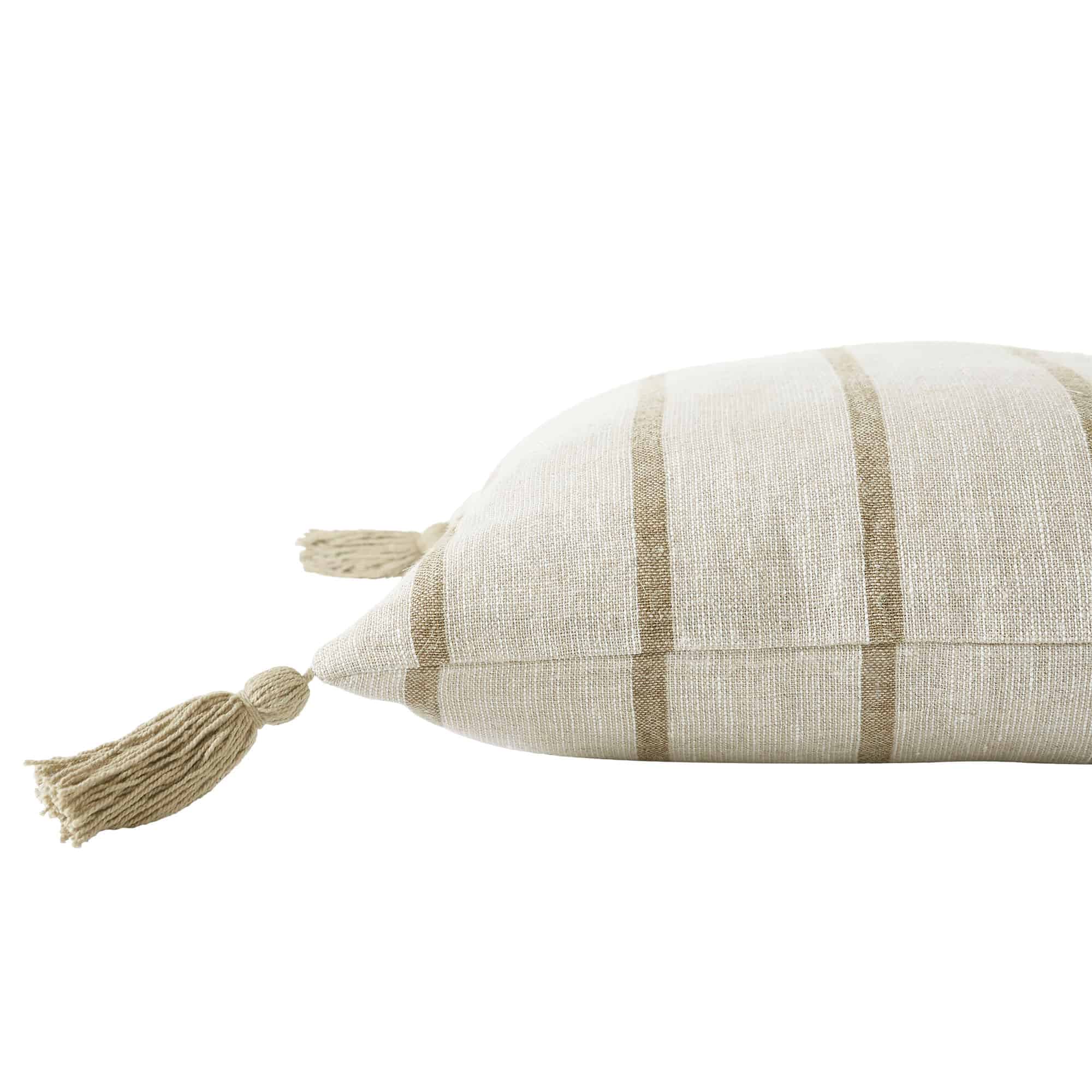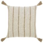 Tassels and stripes take this natural brown throw pillow design to the next level and infuse any interior it enters with charm. Thanks to its versatile square size, this decorative pillow can be placed alone on a seat or bed or arranged with other pillows of differing sizes. This pillow’s 100% linen structure and down/feather filling makes it not only comfortable to rest upon but allows it to maintain its shape over time.